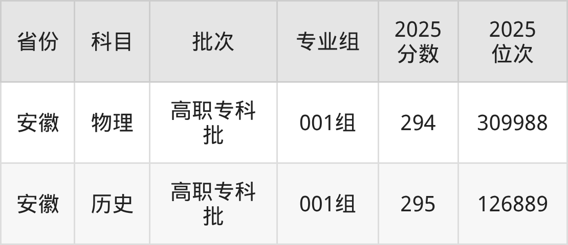 合肥信息技术职业学院001组:2025年投档录取最低分为295分,录取最低位次为126889名。