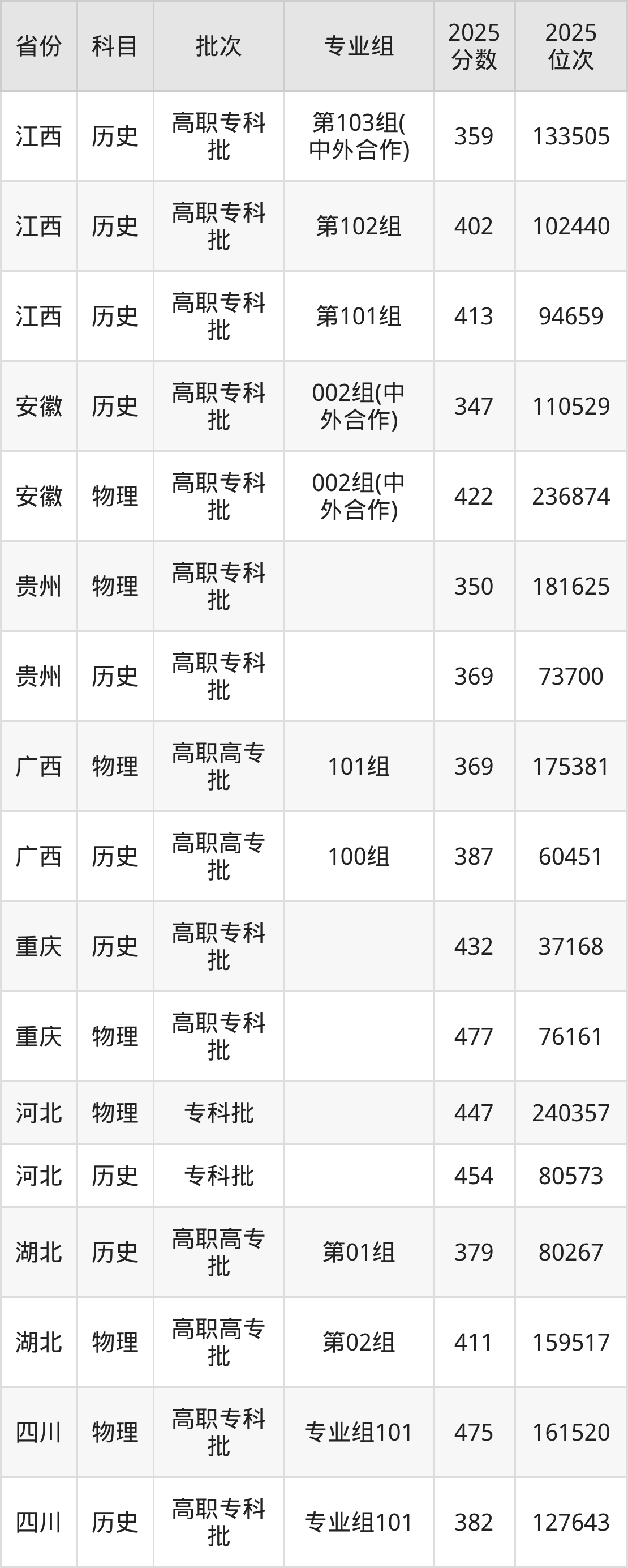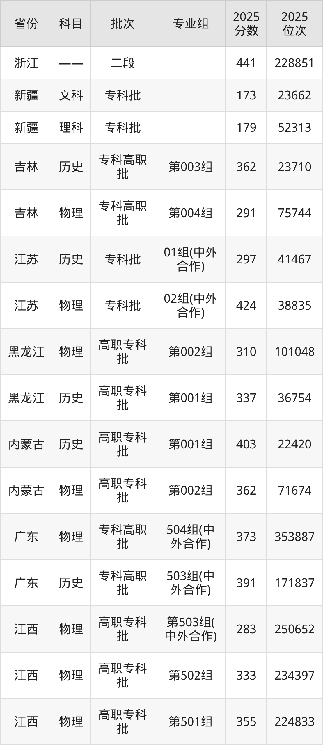 2025年江西信息应用职业技术学院全国录取分数线是173分到477分,录取最低在新疆文科、录取最高在重庆物理类。各省各专业组最低分具有差异,详情如下: