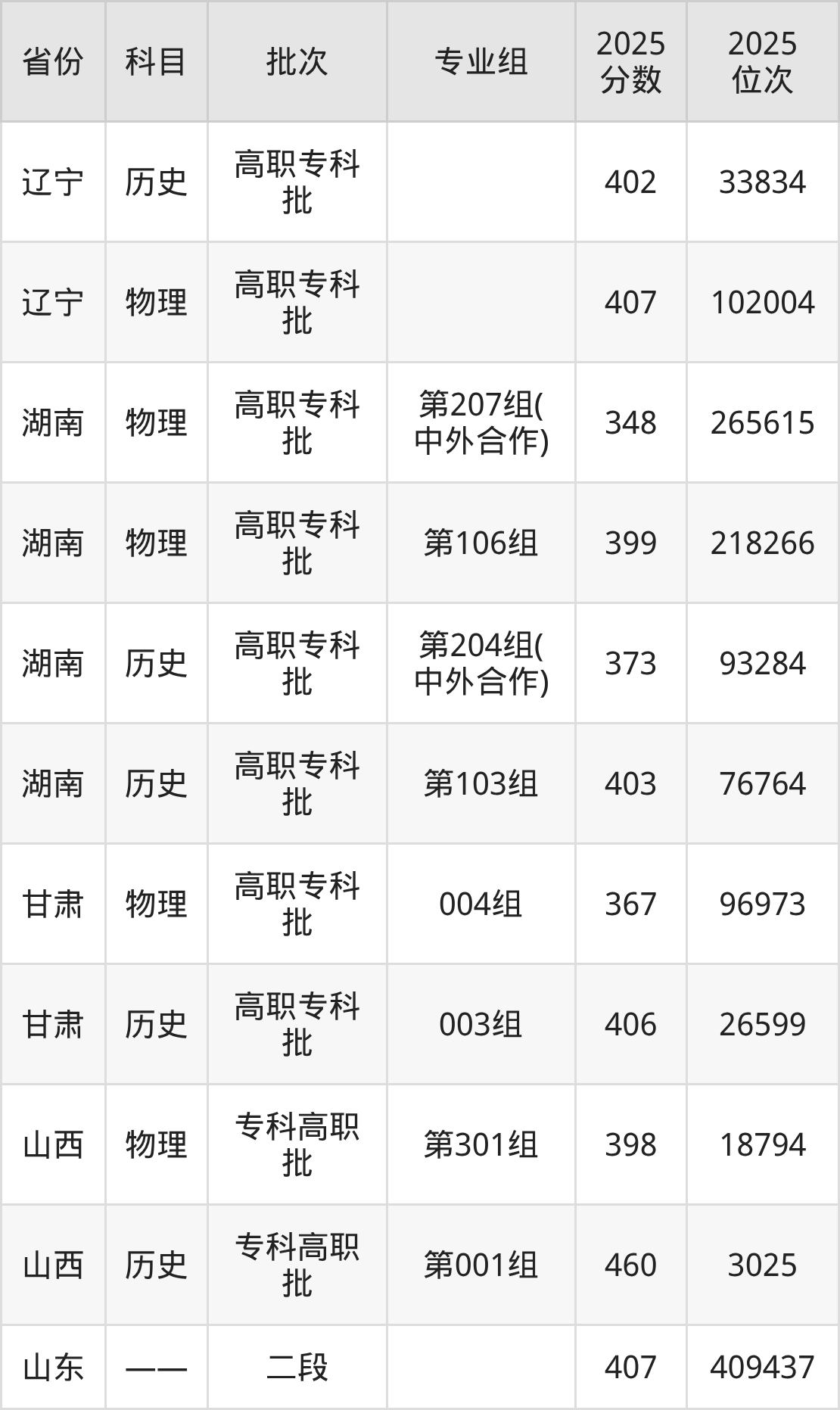 普通类专科历史类最低402分,专科物理类最低407分