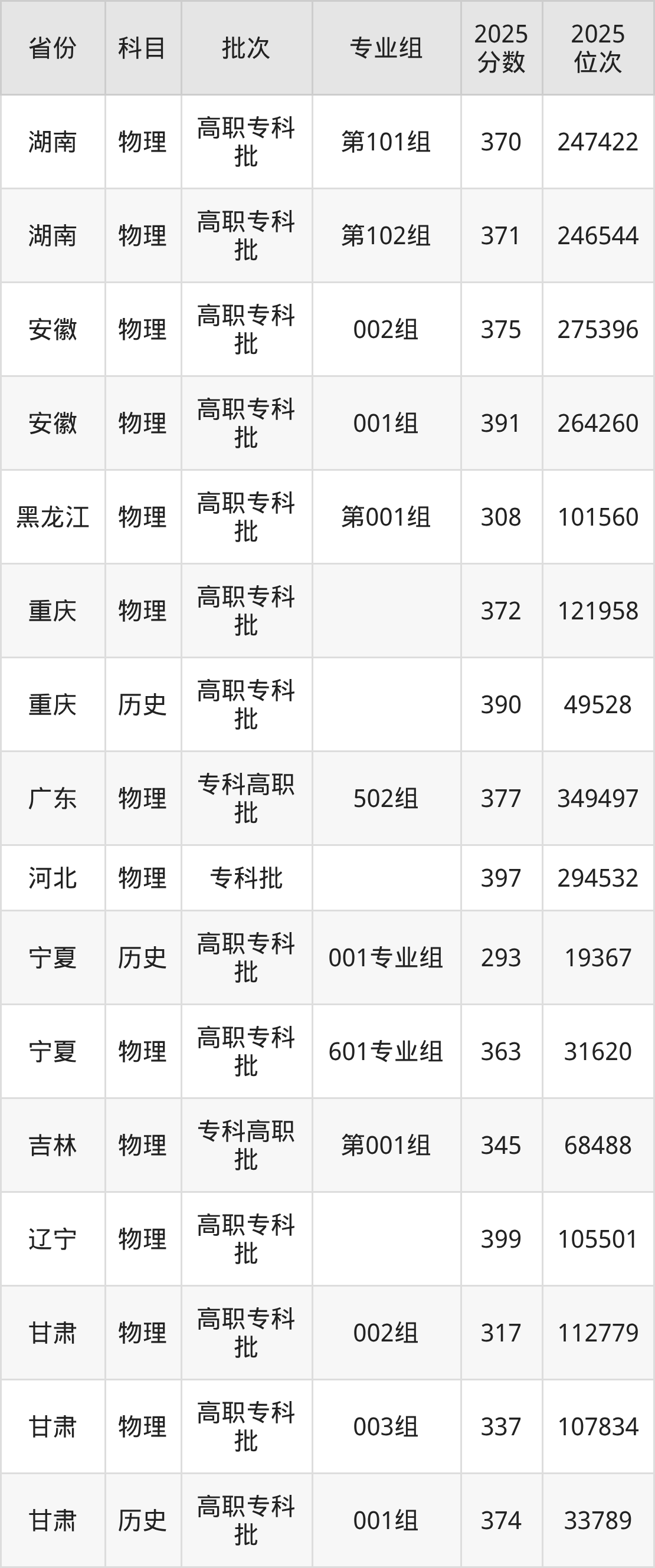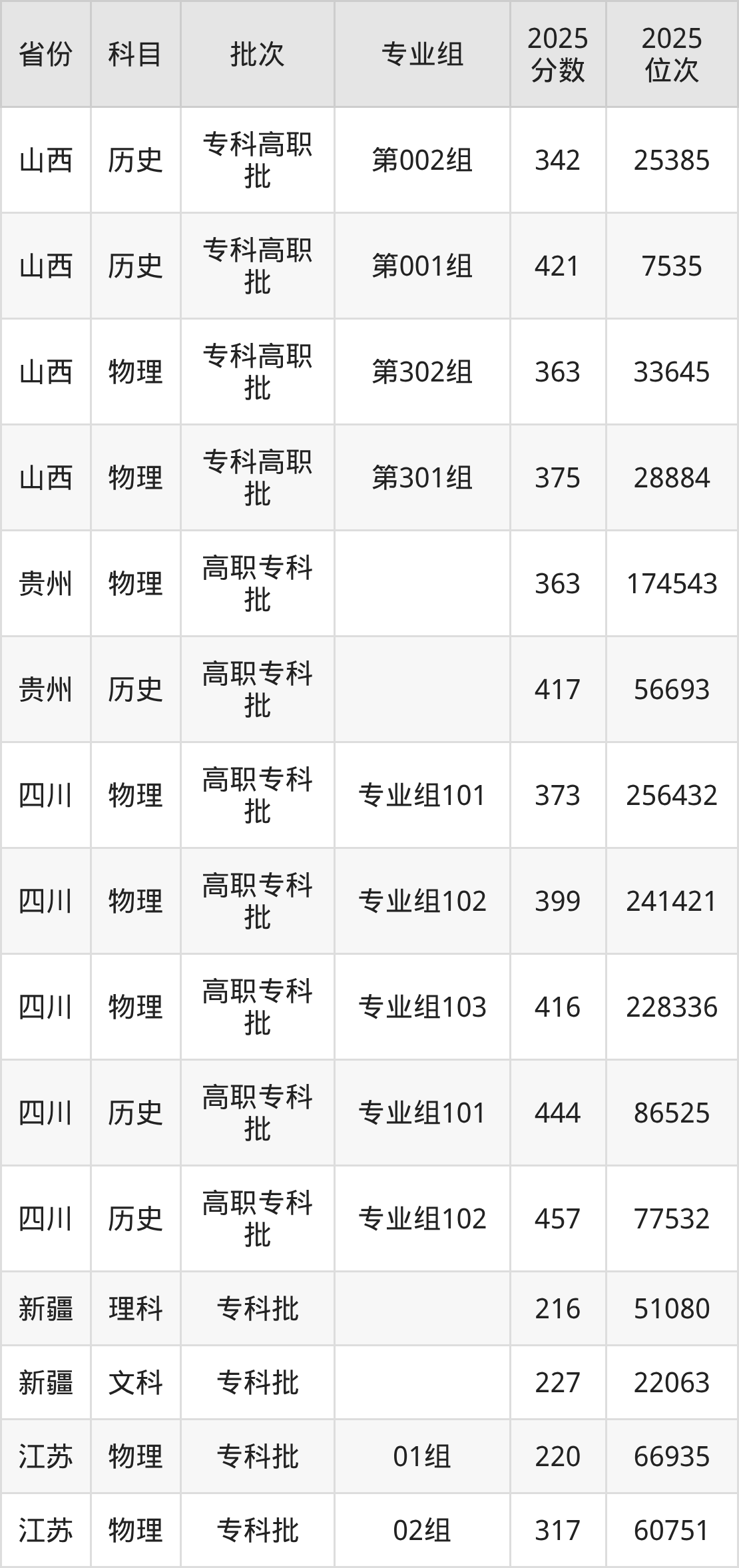 2025年在专科物理类进行招生,各专业组分数线详情如下: