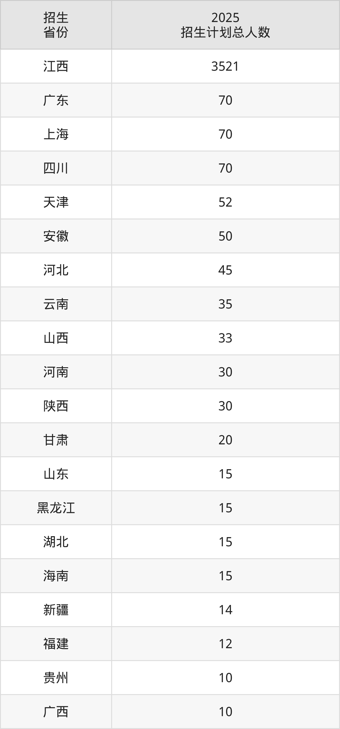 2025年南昌医学院面向全国29个省市开展本科招生;招生专业共19个,招生人数共4184人。2025年在江西省招生计划总人数是3521人,其中,南昌医学院在江西省招生人数最多的是临床医学。南昌医学院在各省具体招生人数情况如下表。