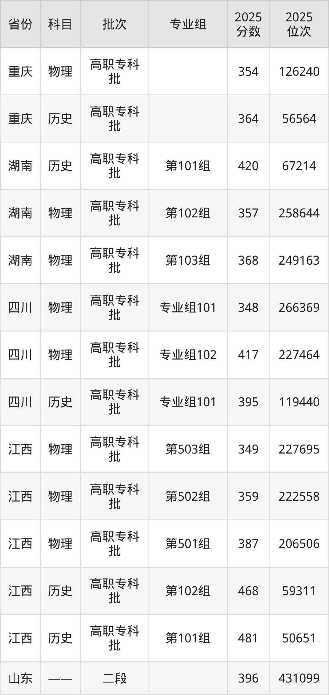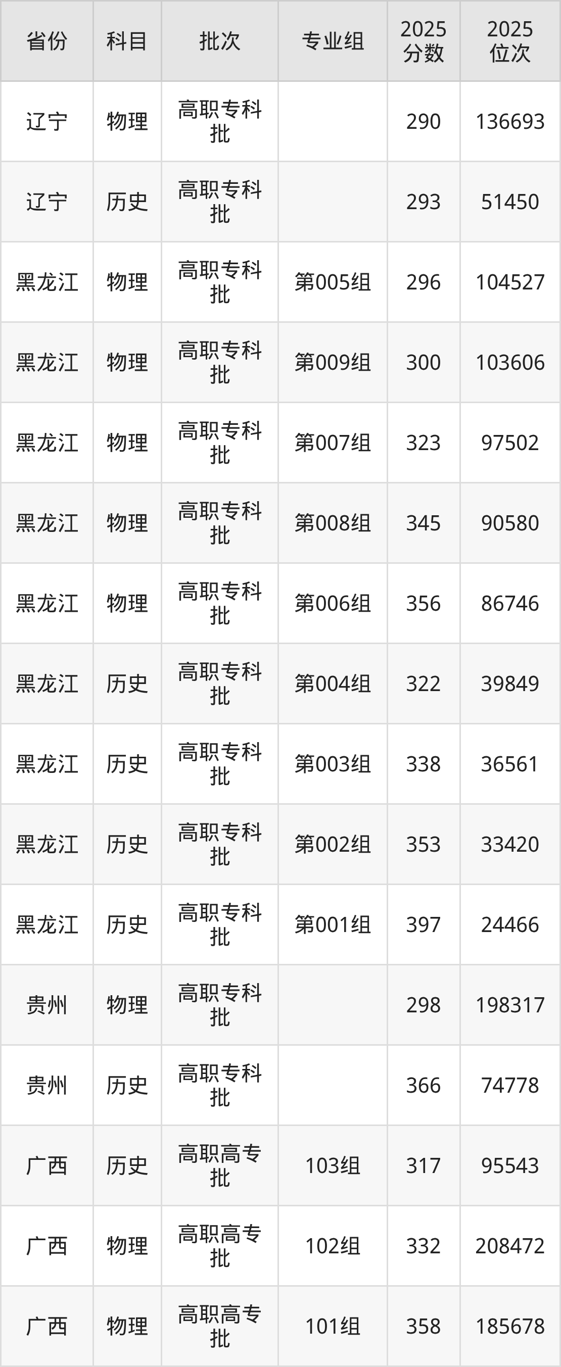 普通类专科物理类最低298分,专科历史类最低366分
