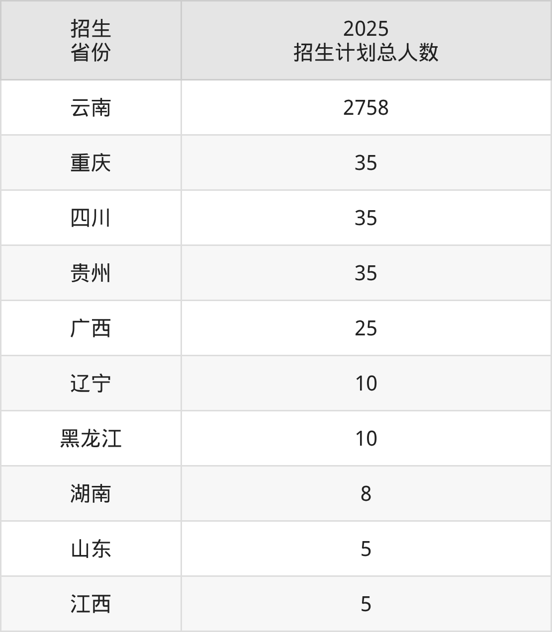 2025年云南农业职业技术学院面向全国10个省市开展专科招生;招生专业共42个,招生人数共2926人。2025年在云南省招生计划总人数是2758人,其中,云南农业职业技术学院在云南省招生人数最多的是酒店管理与数字化运营。云南农业职业技术学院在各省具体招生人数情况如下表。