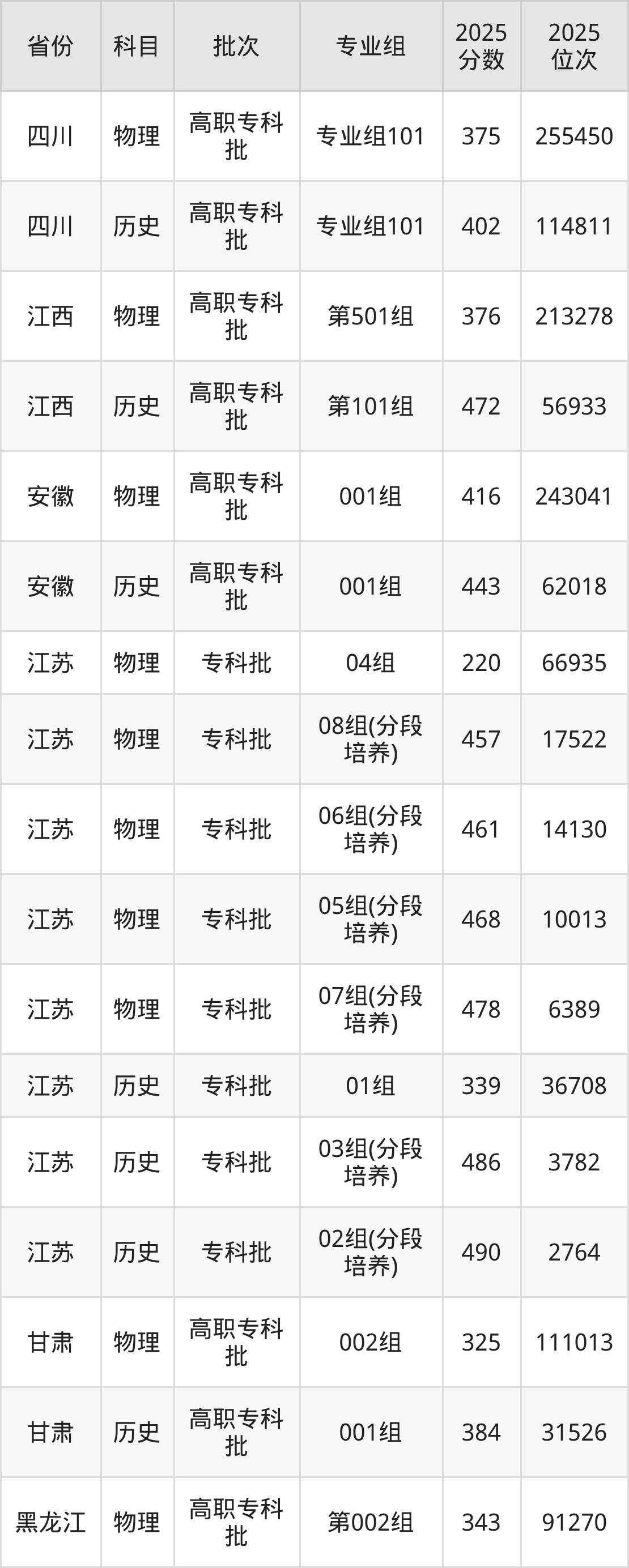 普通类专科物理类最低325分,专科历史类最低384分