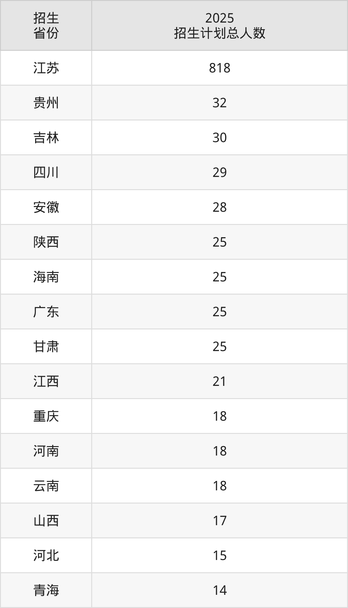 2025年南通师范高等专科学校面向全国19个省市开展专科招生;招生专业共18个,招生人数共1188人。2025年在江苏省招生计划总人数是818人,其中,南通师范高等专科学校在江苏省招生人数最多的是国际经济与贸易。南通师范高等专科学校在各省具体招生人数情况如下表。