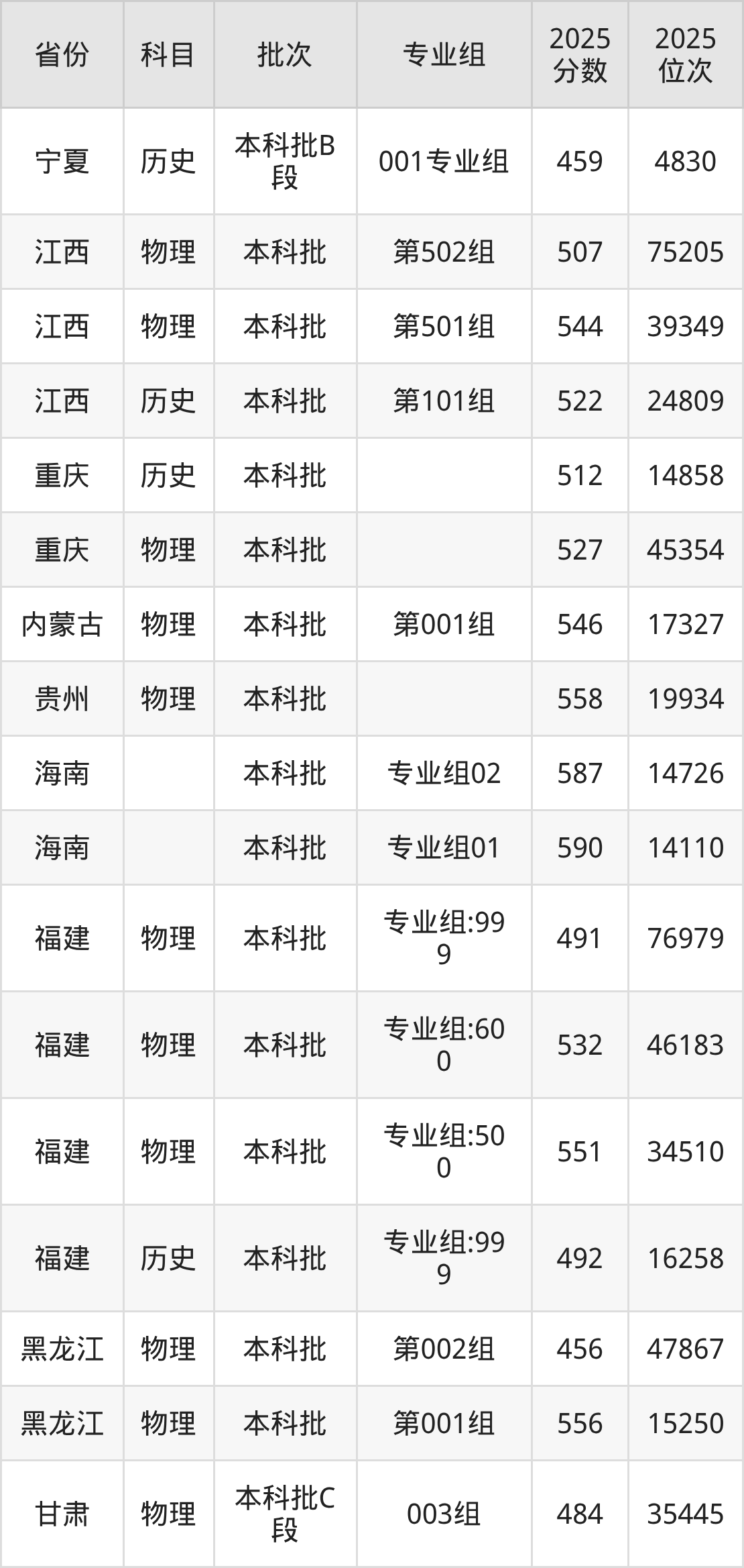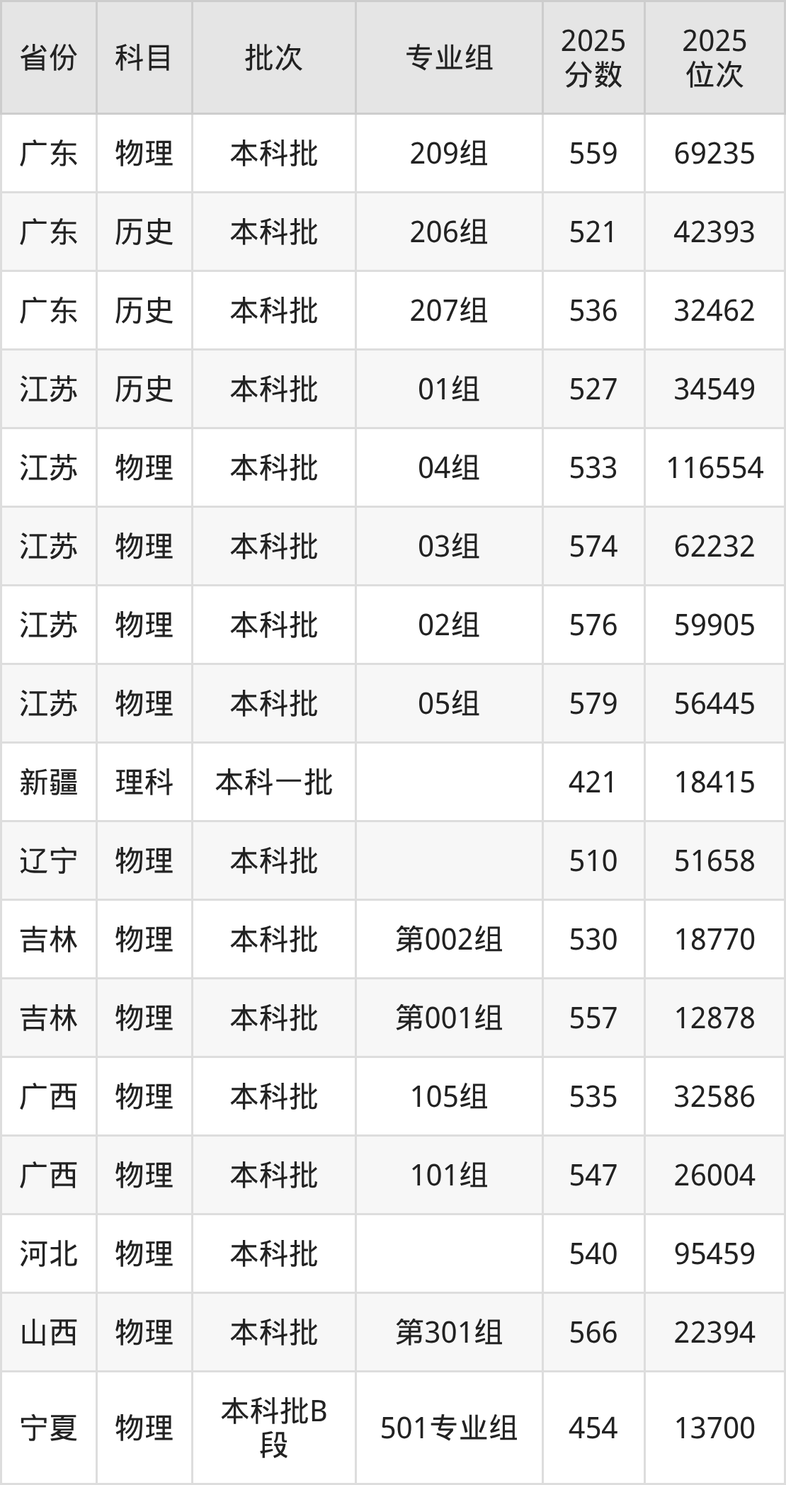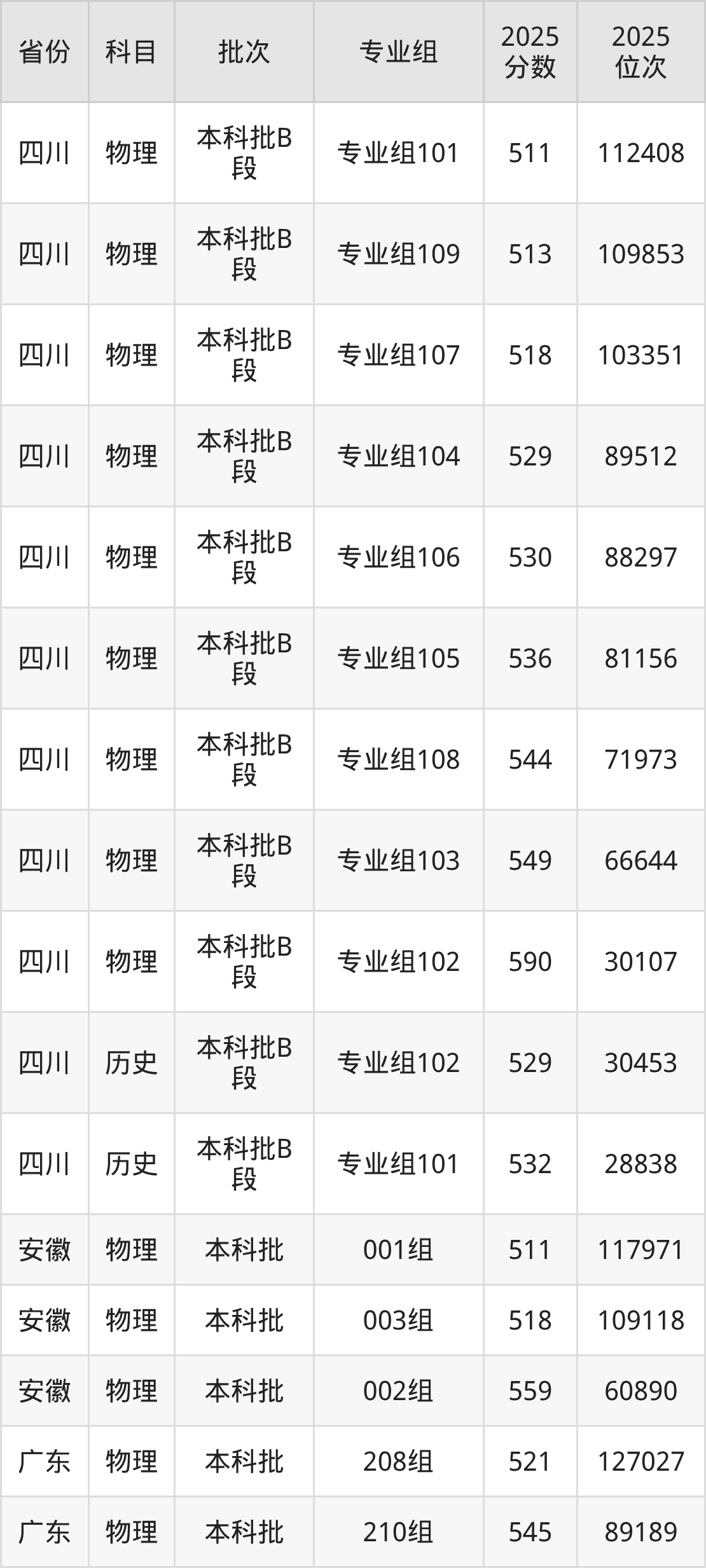 2025年在本科物理类进行招生,各专业组分数线详情如下: