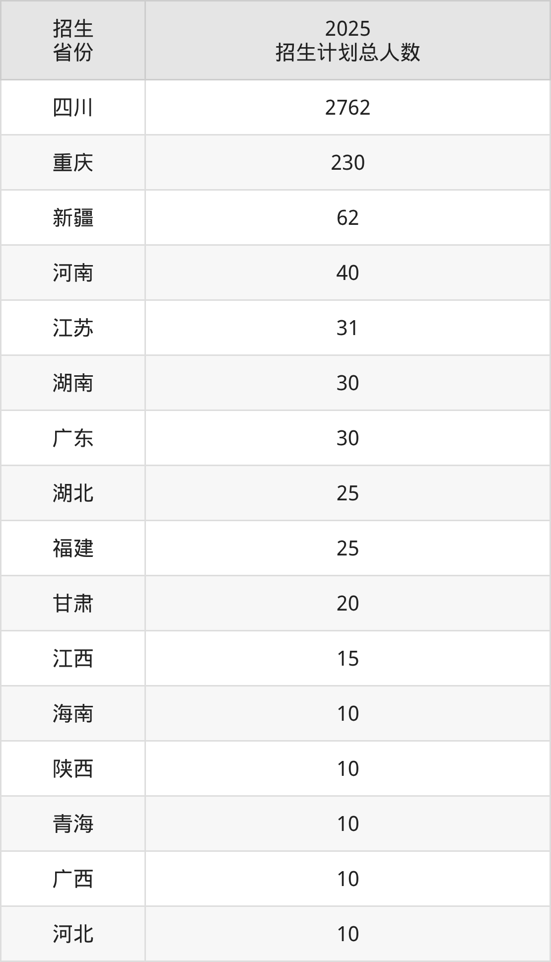 2025年川北医学院面向全国25个省市开展本科招生;招生专业共26个,招生人数共3370人。2025年在四川省招生计划总人数是2762人,其中,川北医学院在四川省招生人数最多的是临床医学。川北医学院在各省具体招生人数情况如下表。