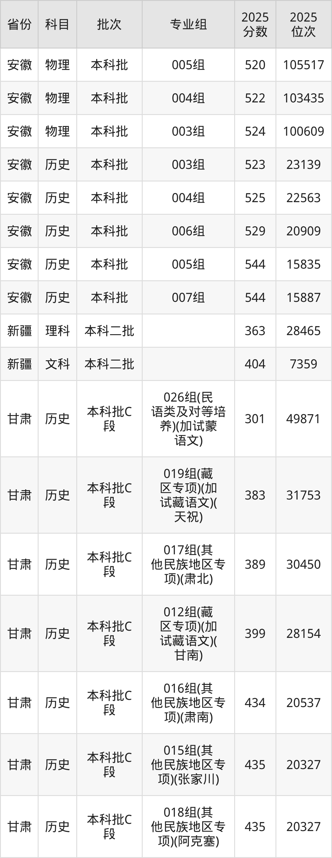 西北民族大学005组:2025年投档录取最低分为520分,录取最低位次为105517名。