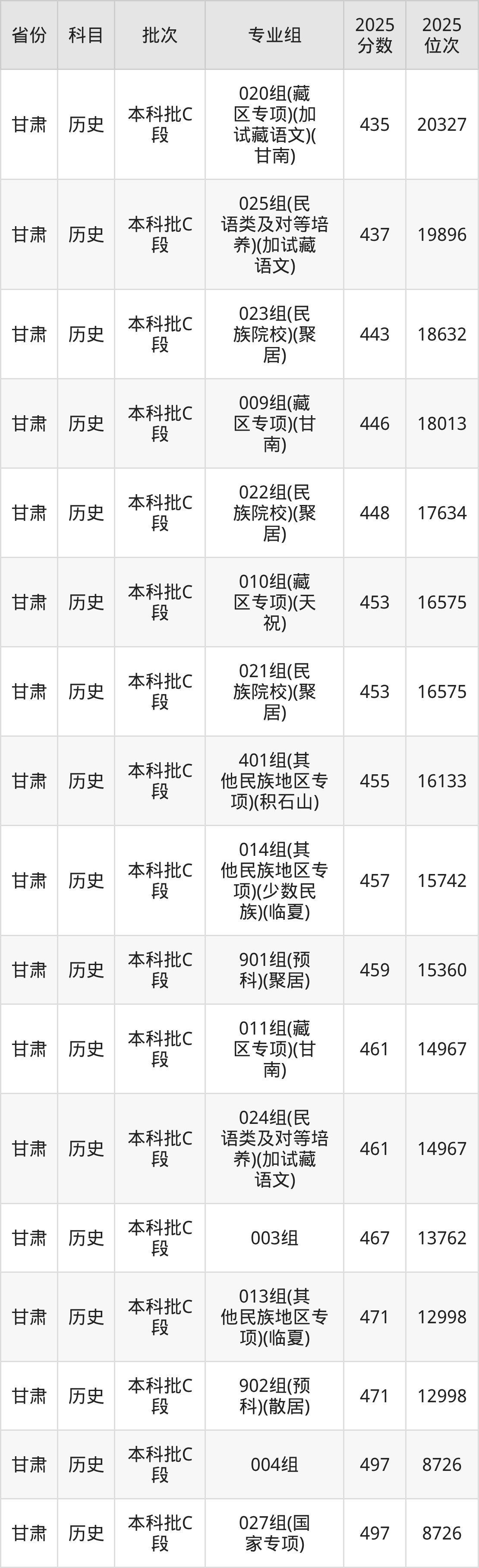 西北民族大学020专业组(藏区专项)(加试藏语文)(甘南):2025年投档录取最低分为435分,录取最低位次为20327名。