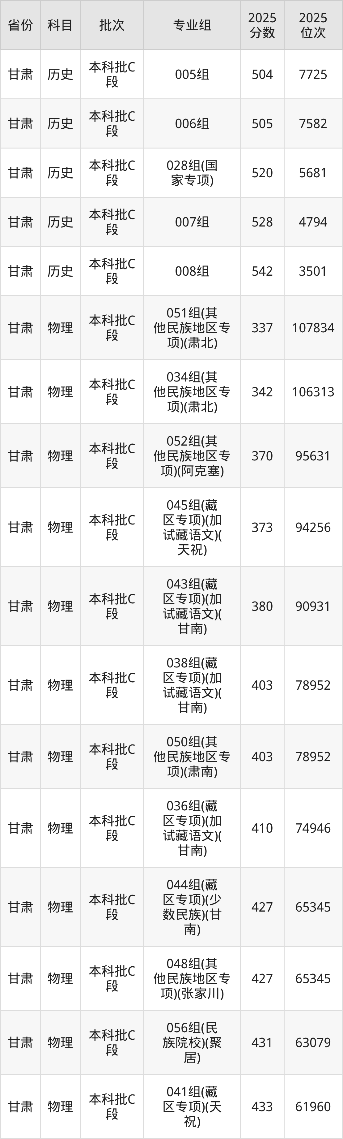 西北民族大学051专业组(其他民族地区专项)(肃北):2025年投档录取最低分为337分,录取最低位次为107834名。