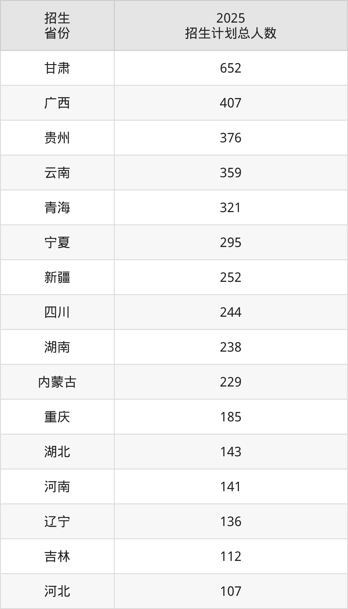 2025年西北民族大学面向全国28个省市开展本科招生;招生专业共51个,招生人数共4747人。2025年在甘肃省招生计划总人数是652人,其中,西北民族大学在甘肃省招生人数最多的是临床医学。西北民族大学在各省具体招生人数情况如下表。