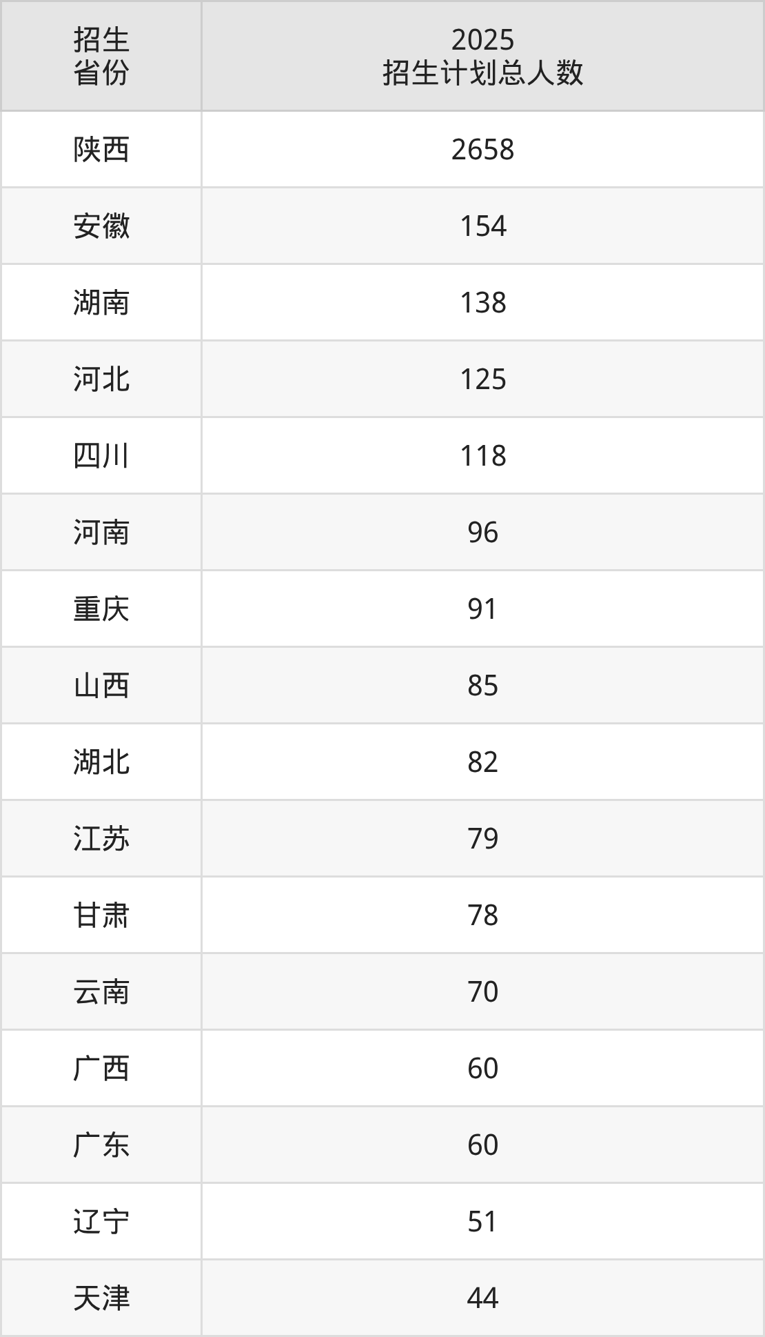 2025年西安建筑科技大学面向全国28个省市开展本科招生;招生专业共53个,招生人数共4292人。2025年在陕西省招生计划总人数是2658人,其中,西安建筑科技大学在陕西省招生人数最多的是机械类。西安建筑科技大学在各省具体招生人数情况如下表。