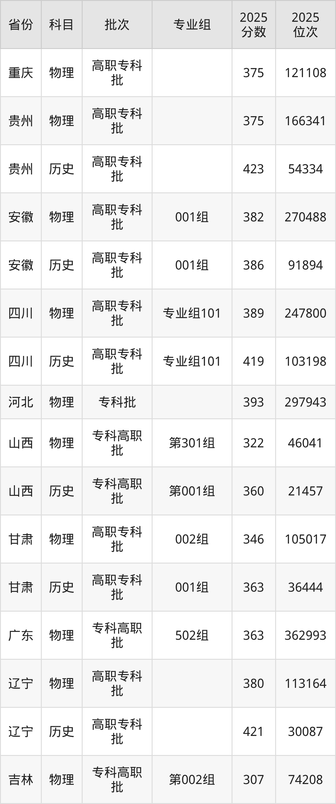 2025年在专科物理类进行招生,各专业组分数线详情如下: