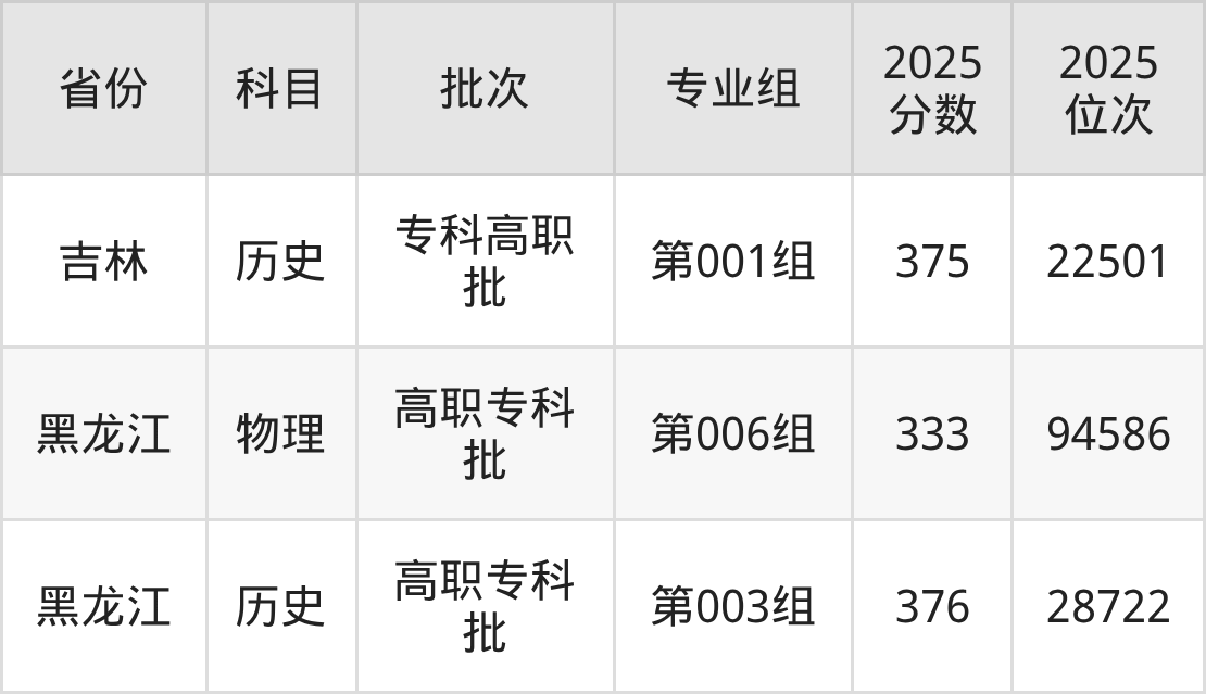 黑龙江司法警官职业学院第003组:2025年投档录取最低分为376分,录取最低位次为28722名。