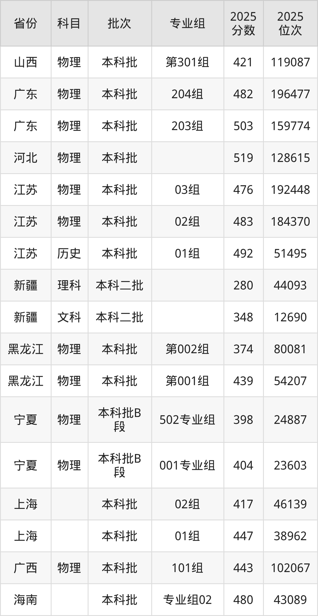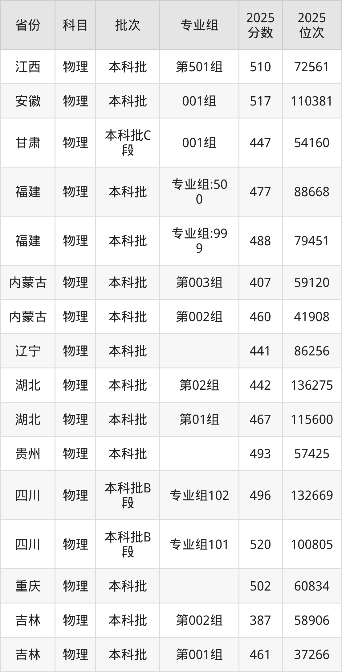 2025年在本科物理类进行招生,各专业组分数线详情如下: