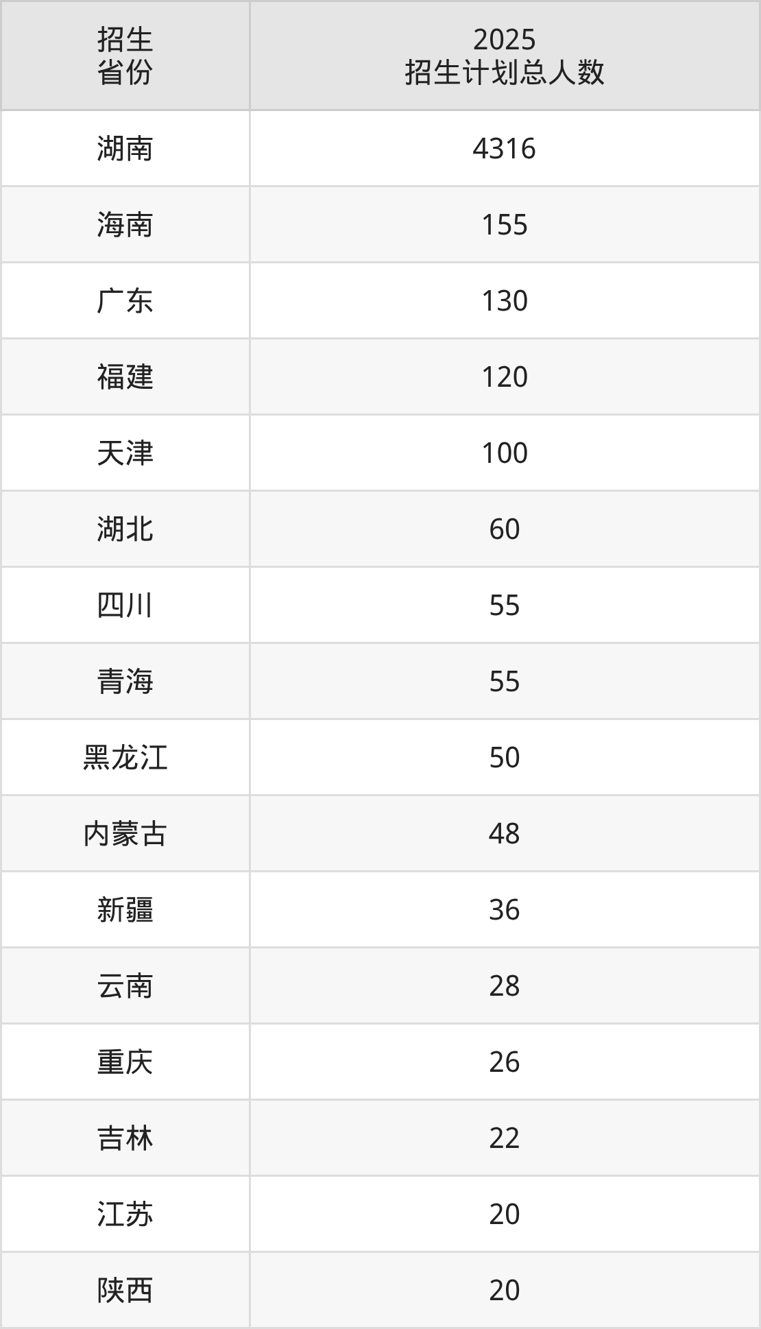 2025年长沙医学院面向全国28个省市开展本科招生;招生专业共34个,招生人数共4436人。2025年在湖南省招生计划总人数是4316人,其中,长沙医学院在湖南省招生人数最多的是临床医学。长沙医学院在各省具体招生人数情况如下表。