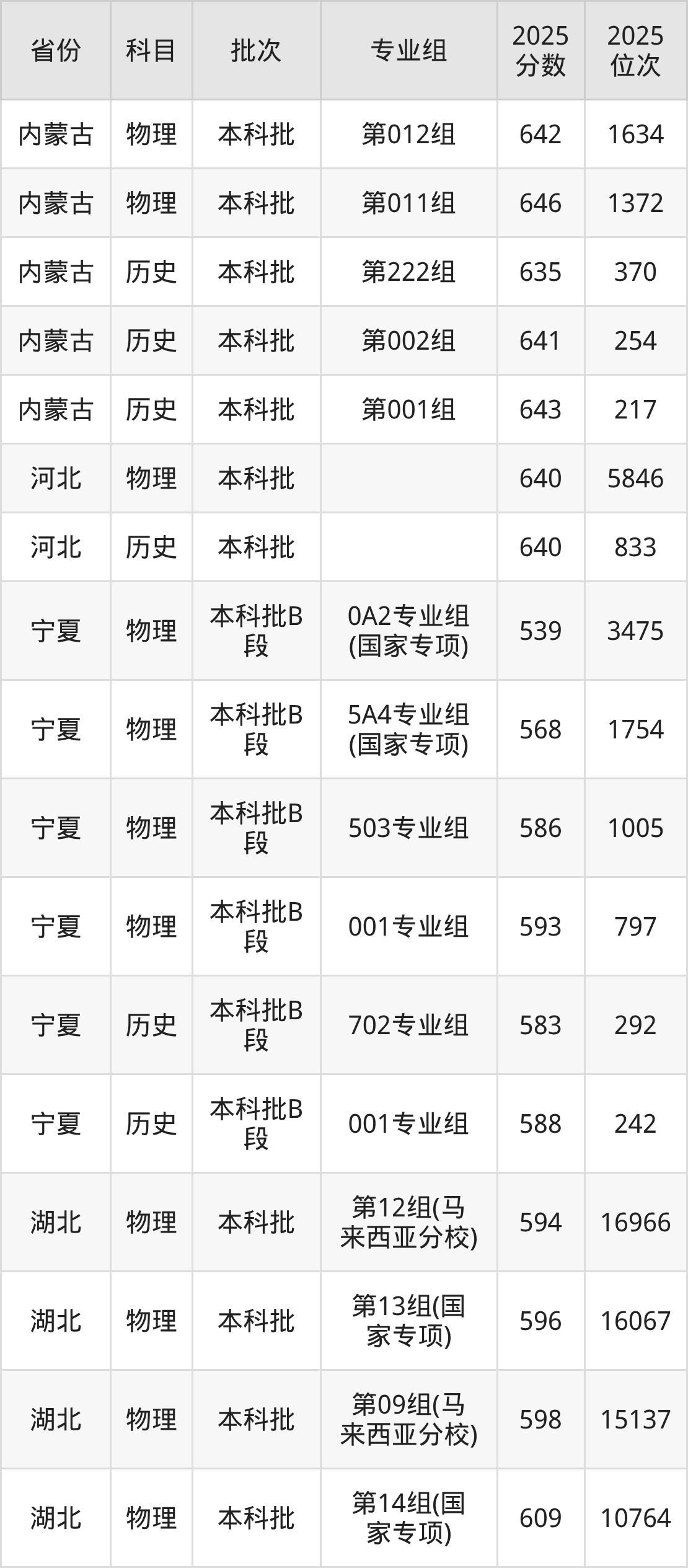 厦门大学第013组(马来西亚分校):2025年投档录取最低分为583分,录取最低位次为8123名。