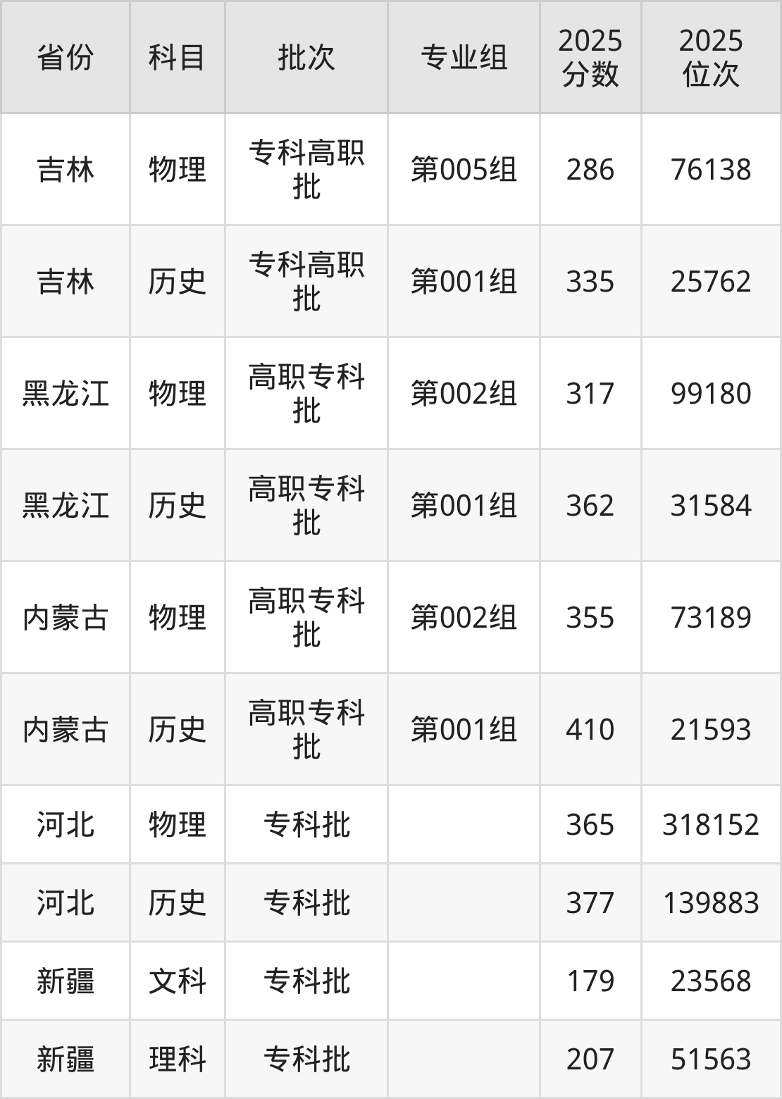 2025年四平职业大学全国录取分数线是179分到410分,录取最低在新疆文科、录取最高在内蒙古历史类(第001组)。各省各专业组最低分具有差异,详情如下: