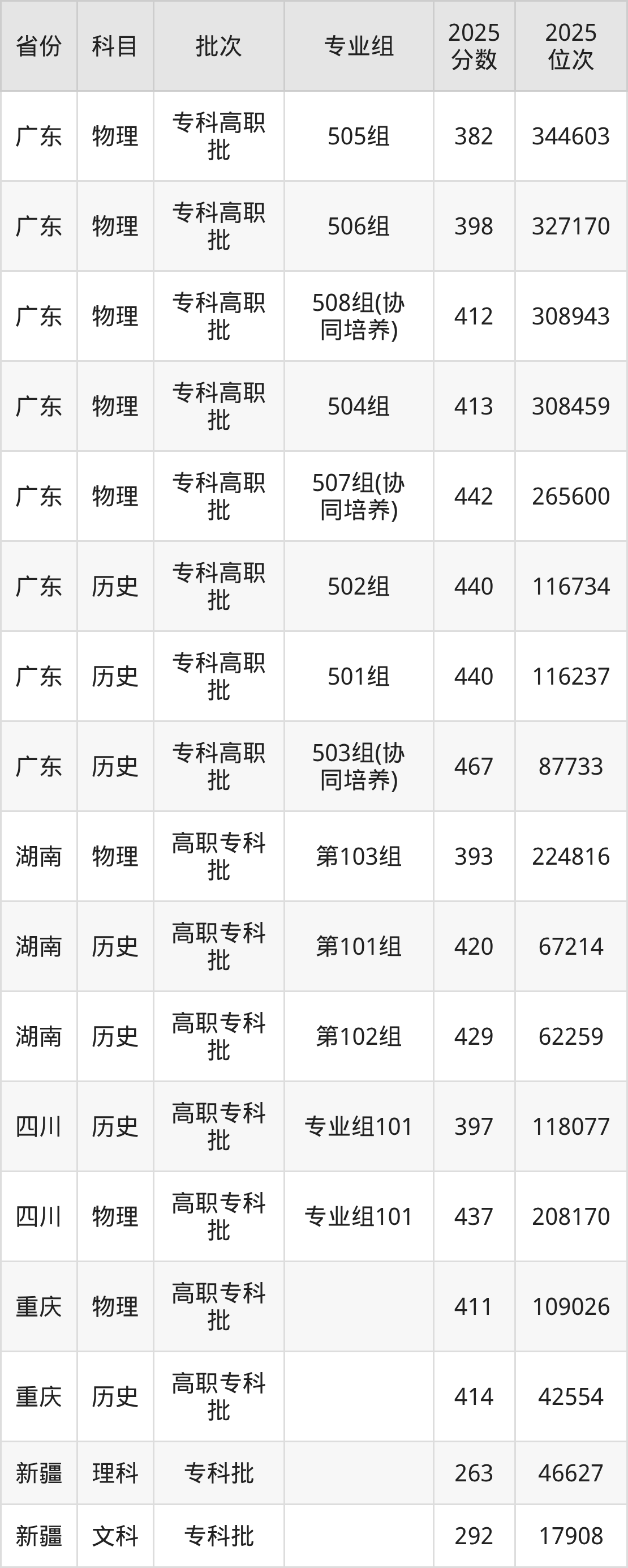 惠州卫生职业技术学院505组:2025年投档录取最低分为382分,录取最低位次为344603名。