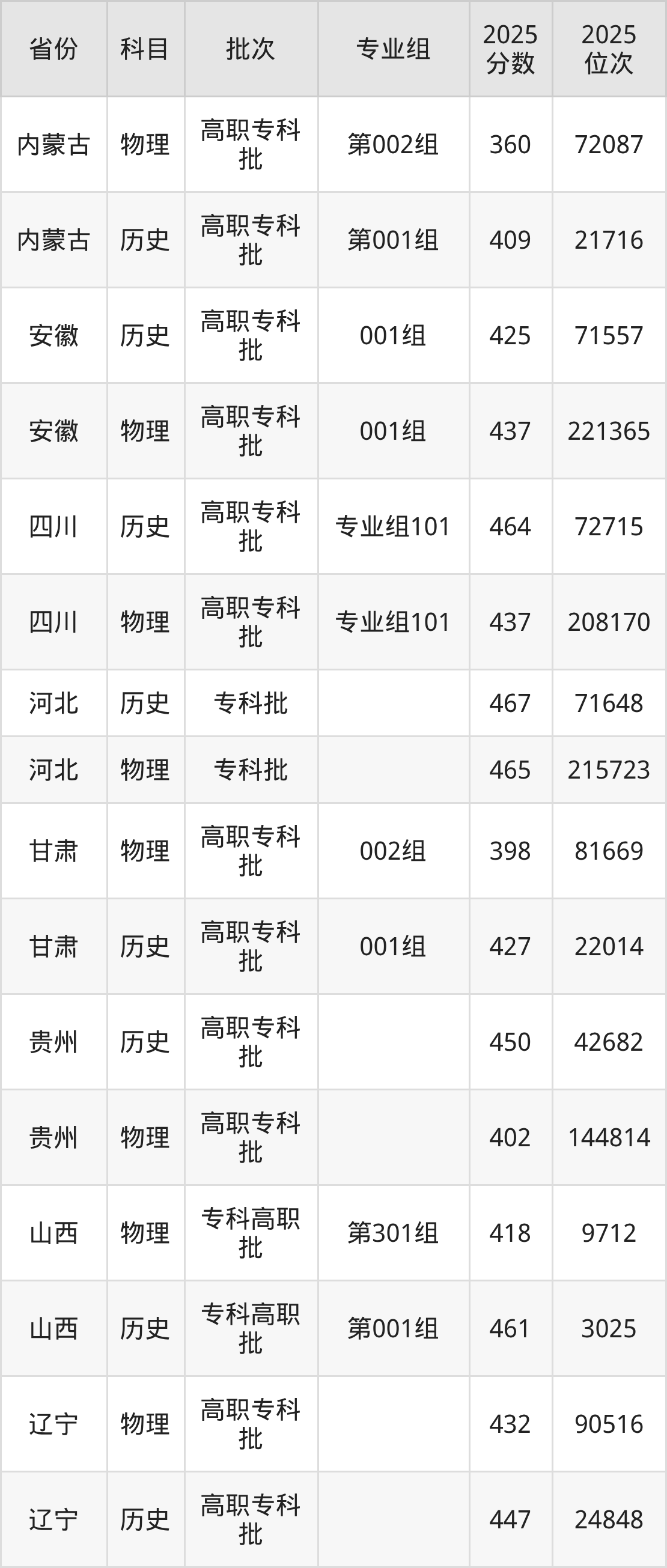 普通类专科物理类最低402分,专科历史类最低450分