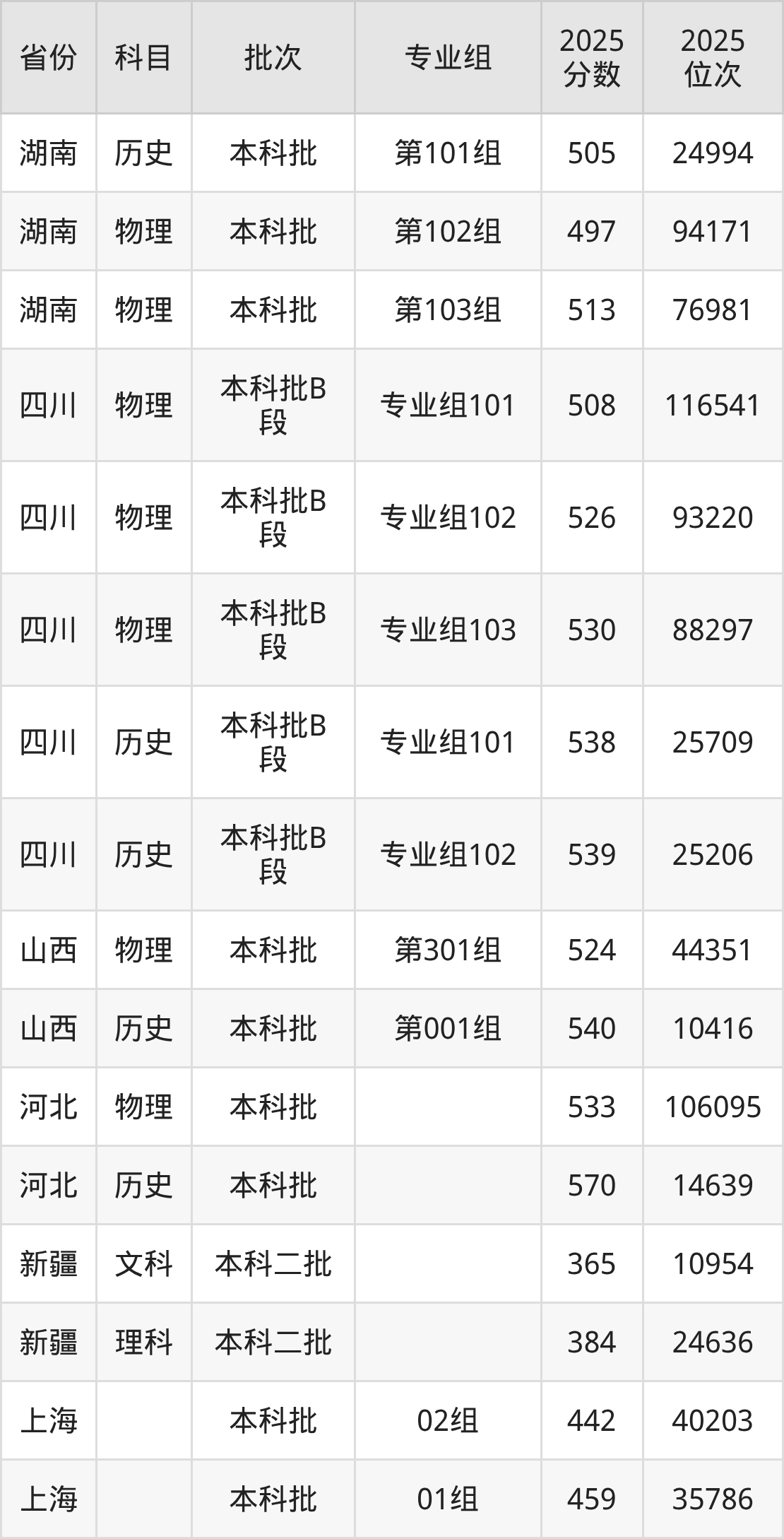 2025年投档录取最低分为384分,录取最低位次为24636名。