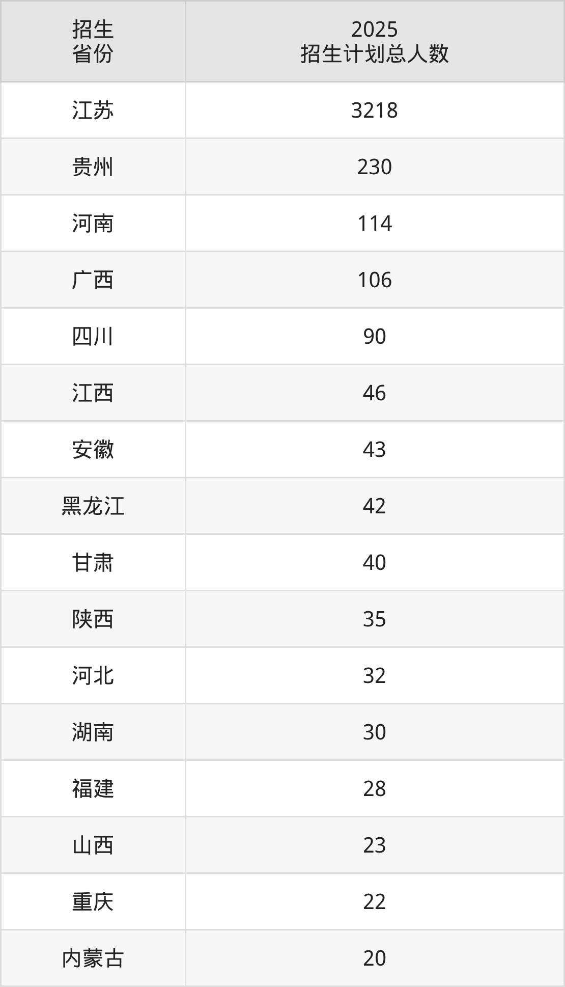 2025年江苏理工学院面向全国25个省市开展本科招生;招生专业共52个,招生人数共4254人。2025年在江苏省招生计划总人数是3218人,其中,江苏理工学院在江苏省招生人数最多的是电气工程及其自动化。江苏理工学院在各省具体招生人数情况如下表。