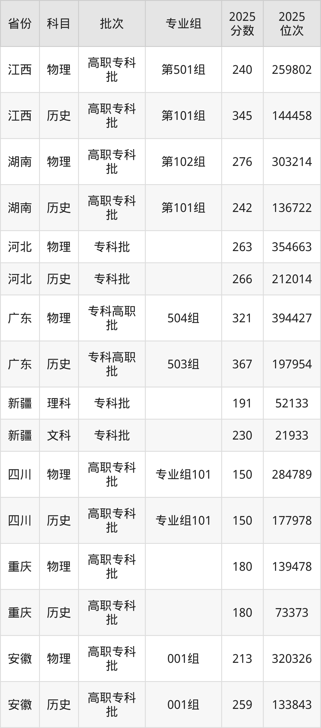 普通类专科物理类最低213分,专科历史类最低259分