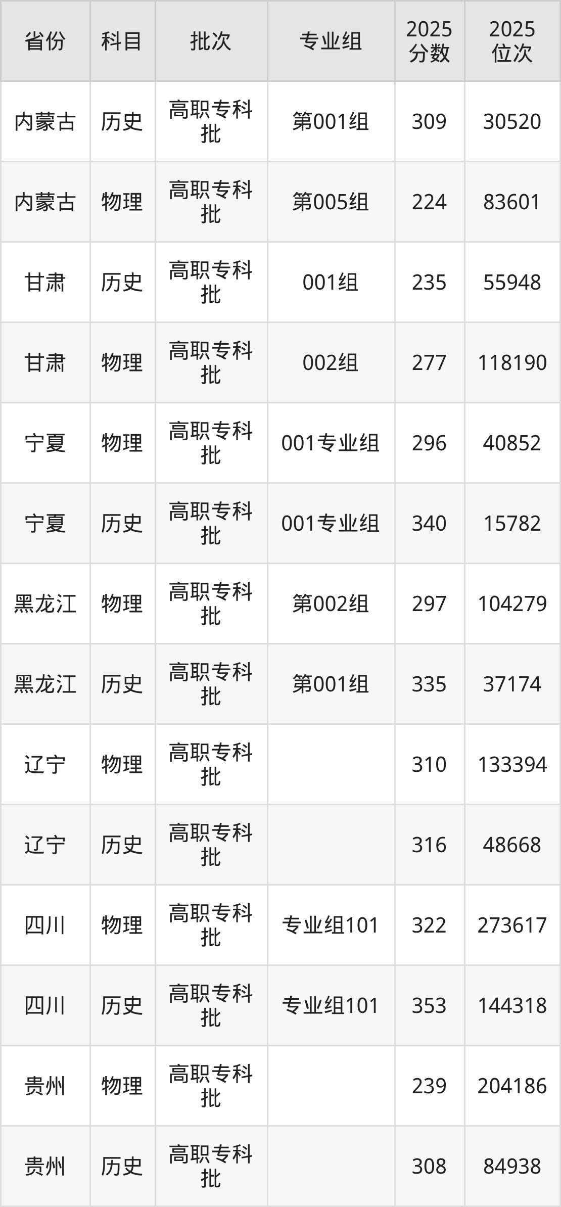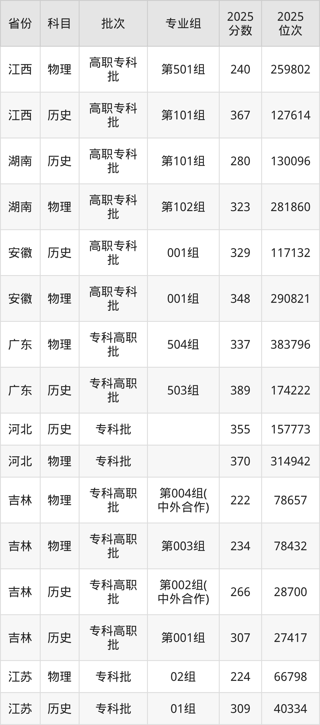 普通类专科物理类最低296分,专科历史类最低340分