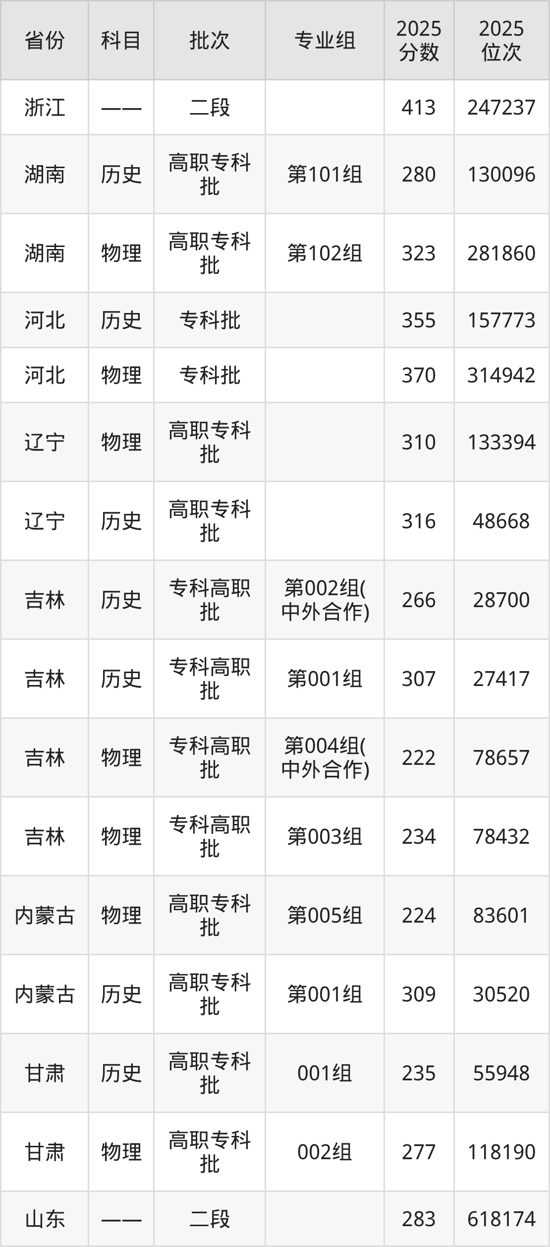 2025年枣庄科技职业学院全国录取分数线是222分到490分,录取最低在吉林物理类(第004组(中外合作))、录取最高在山东。各省各专业组最低分具有差异,详情如下: