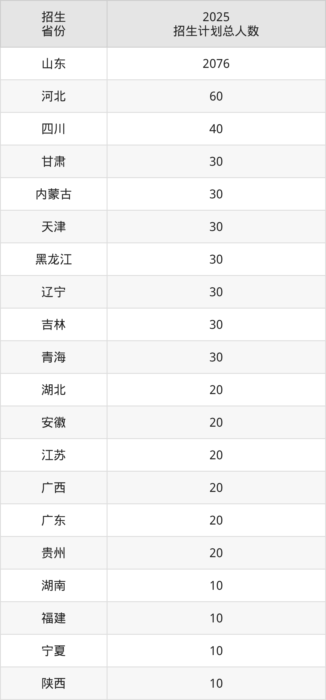 2025年枣庄科技职业学院面向全国21个省市开展专科招生;招生专业共45个,招生人数共2556人。2025年在山东省招生计划总人数是2076人,其中,枣庄科技职业学院在山东省招生人数最多的是护理。枣庄科技职业学院在各省具体招生人数情况如下表。