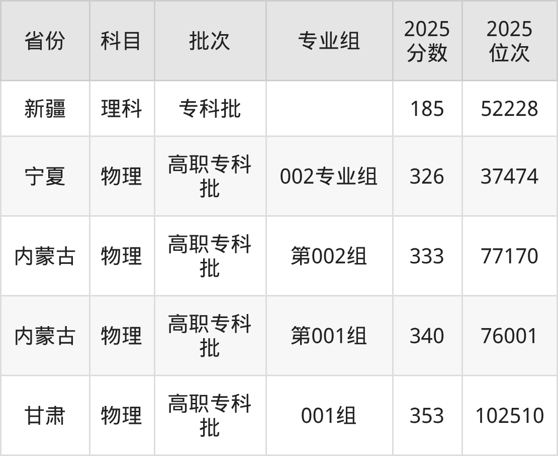 2025年在专科物理类进行招生,各专业组分数线详情如下: