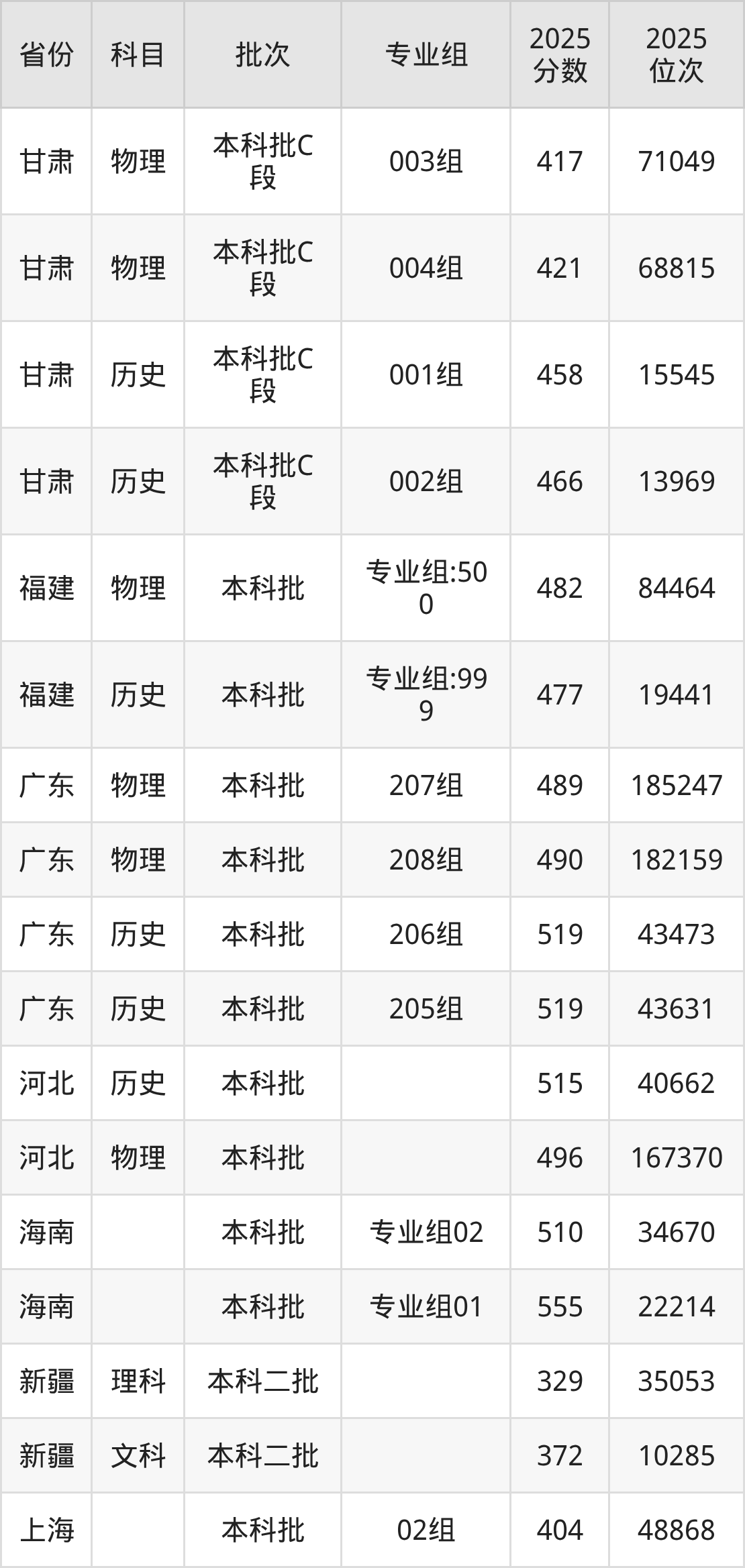 2025年昌吉学院全国录取分数线是329分到555分,录取最低在新疆理科、录取最高在海南(专业组01)。各省各专业组最低分具有差异,详情如下: