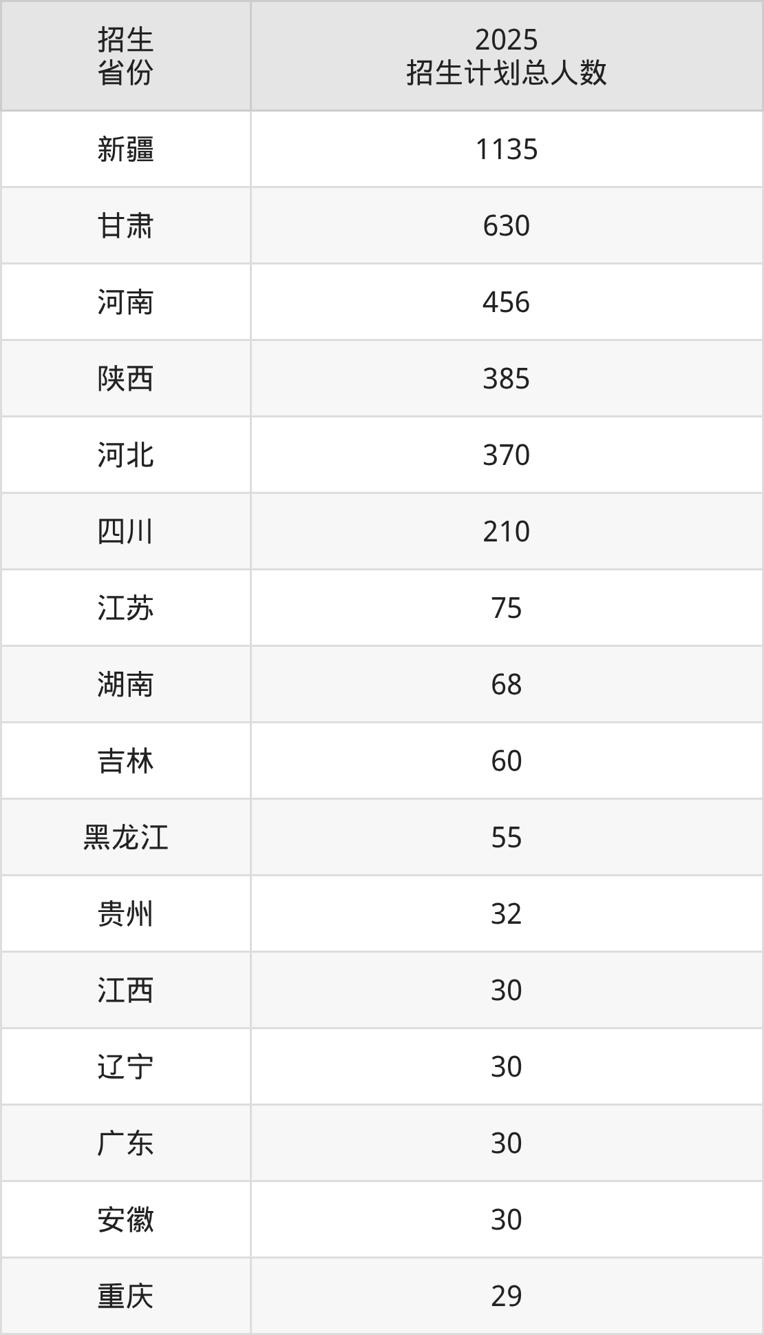 2025年昌吉学院面向全国28个省市开展本科招生;招生专业共52个,招生人数共3537人。2025年在新疆维吾尔自治区招生计划总人数是1135人,其中,昌吉学院在新疆维吾尔自治区招生人数最多的是中国少数民族语言文学。昌吉学院在各省具体招生人数情况如下表。