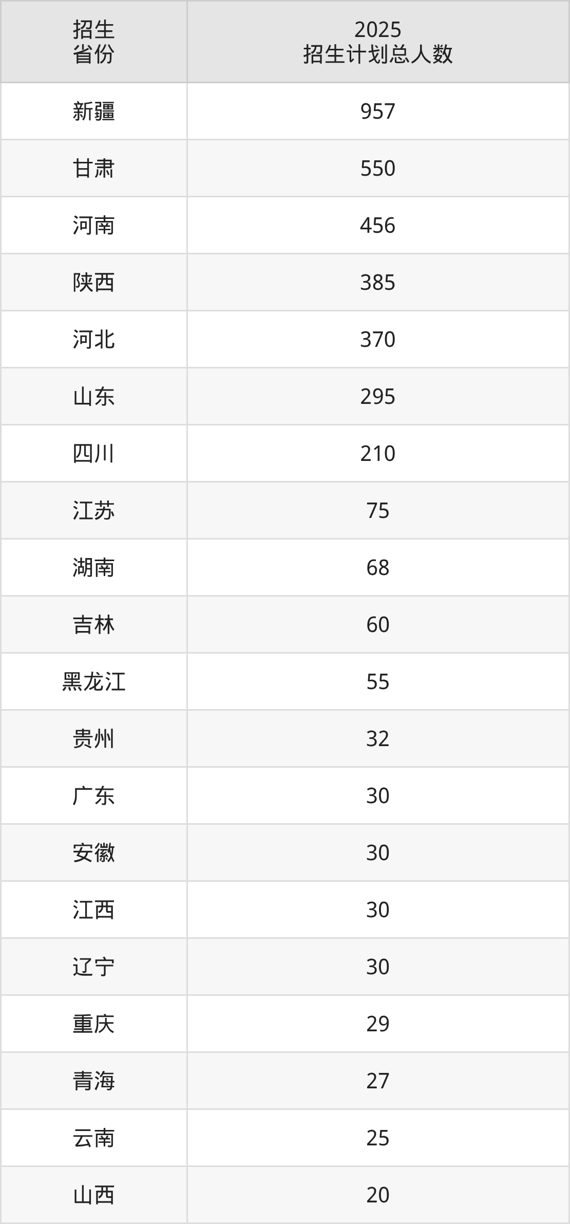 2025年昌吉学院面向全国29个省市开展本科招生;招生专业共52个,招生人数共3832人。2025年在新疆维吾尔自治区招生计划总人数是957人,其中,昌吉学院在新疆维吾尔自治区招生人数最多的是中国少数民族语言文学。昌吉学院在各省具体招生人数情况如下表。