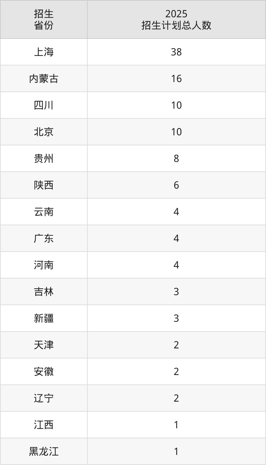 2025年上海戏剧学院面向全国16个省市开展本科招生;招生专业共7个,招生人数共114人。2025年在上海市招生计划总人数是38人,其中,上海戏剧学院在上海市招生人数最多的是艺术管理。上海戏剧学院在各省具体招生人数情况如下表。