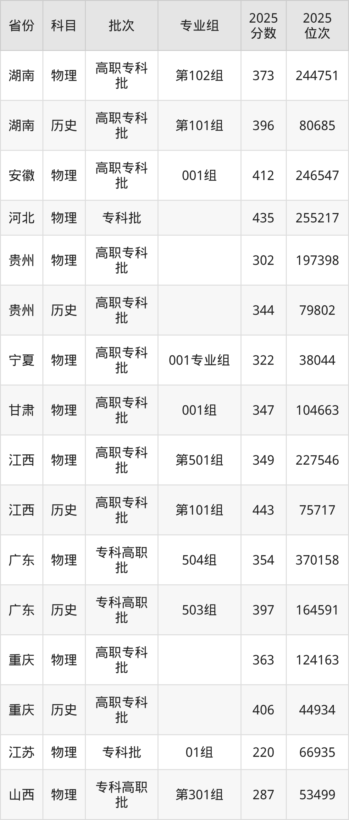 下面是2025年湖南安全技术职业学院全国录取分数线一览表,请查阅。