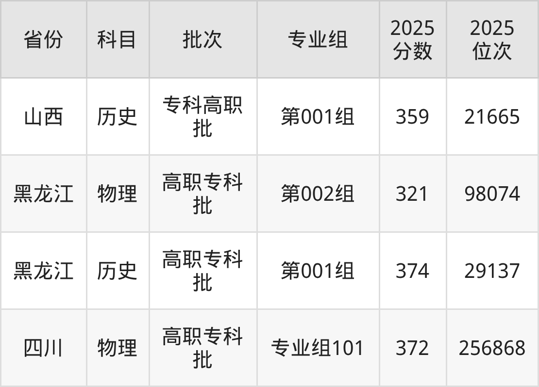 2025年在专科物理类进行招生,各专业组分数线详情如下: