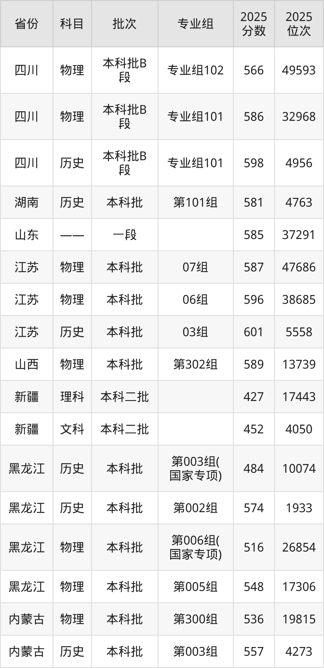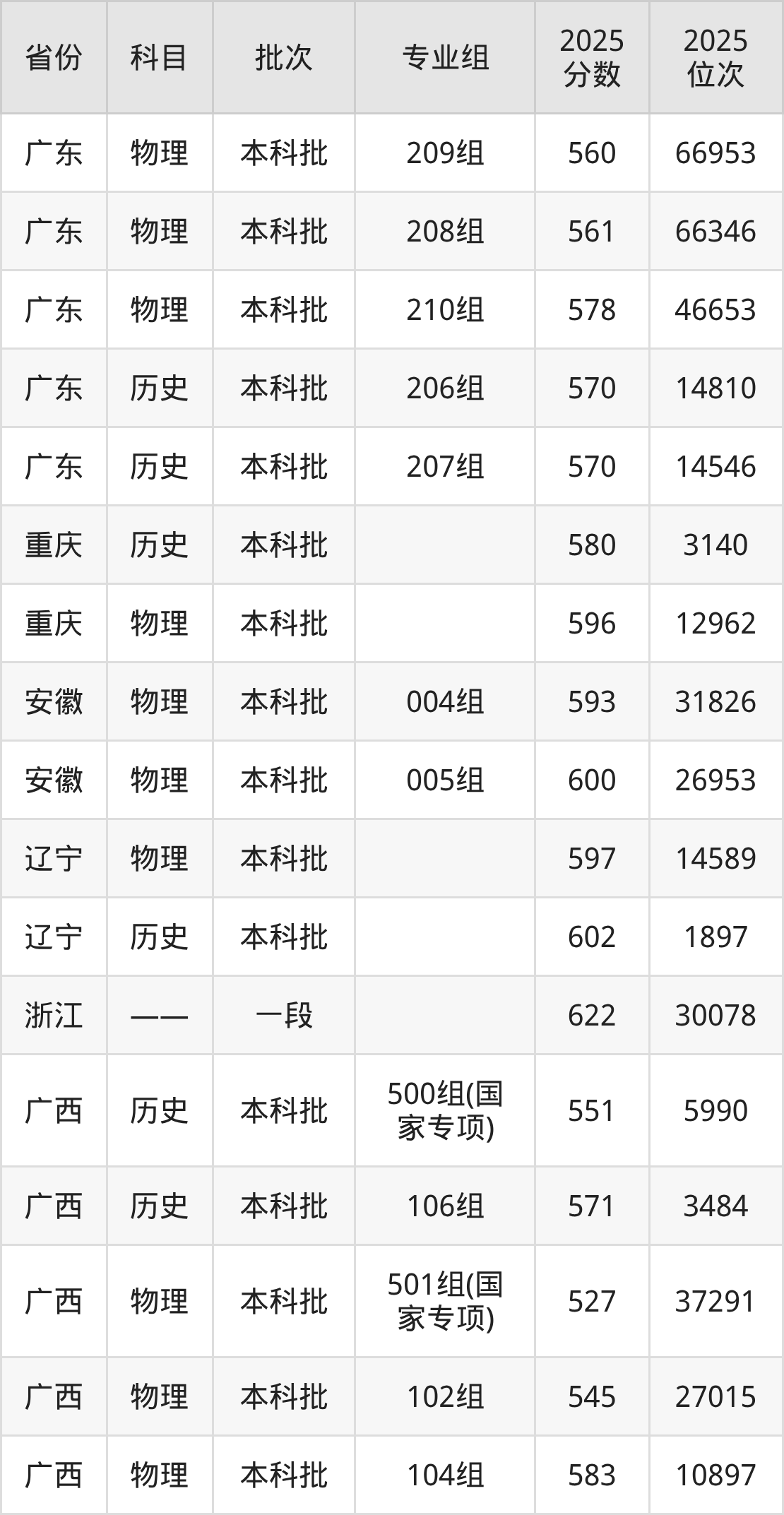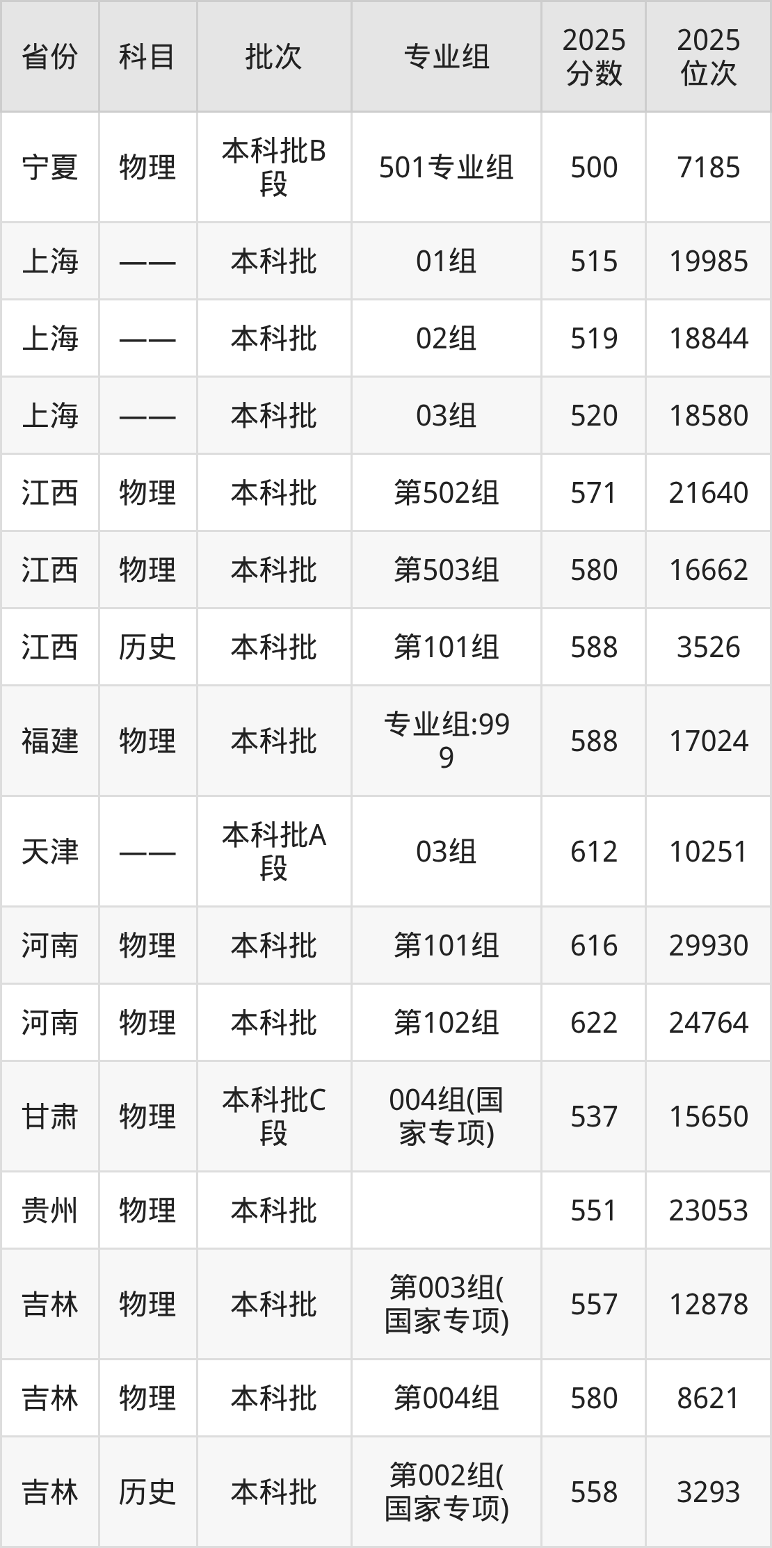 2025年在本科物理类进行招生,各专业组分数线详情如下: