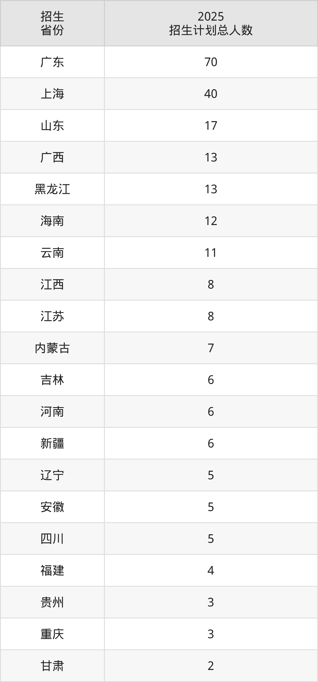 2025年上海海关学院面向全国24个省市开展本科招生;招生专业共7个,招生人数共250人。2025年在上海市招生计划总人数是40人,其中,上海海关学院在上海市招生人数最多的是英语。上海海关学院在各省具体招生人数情况如下表。