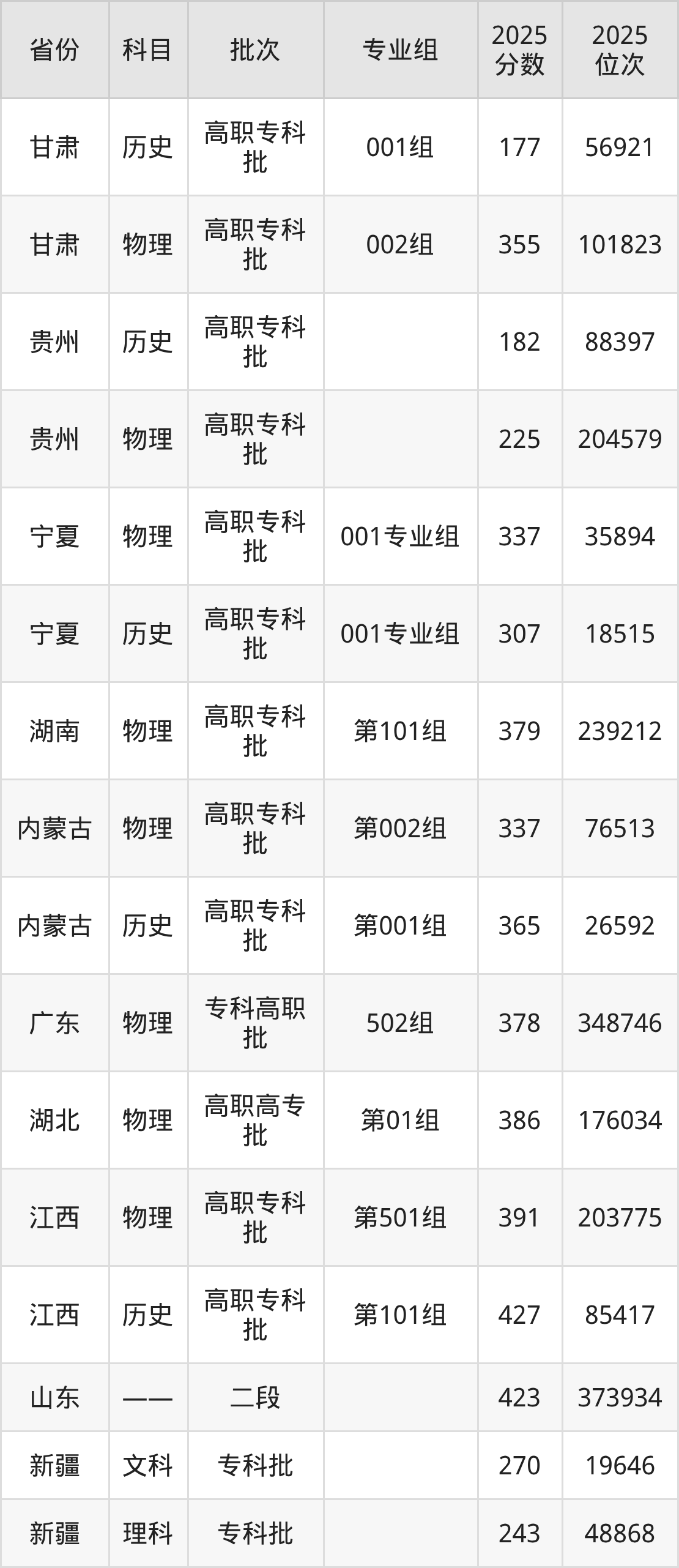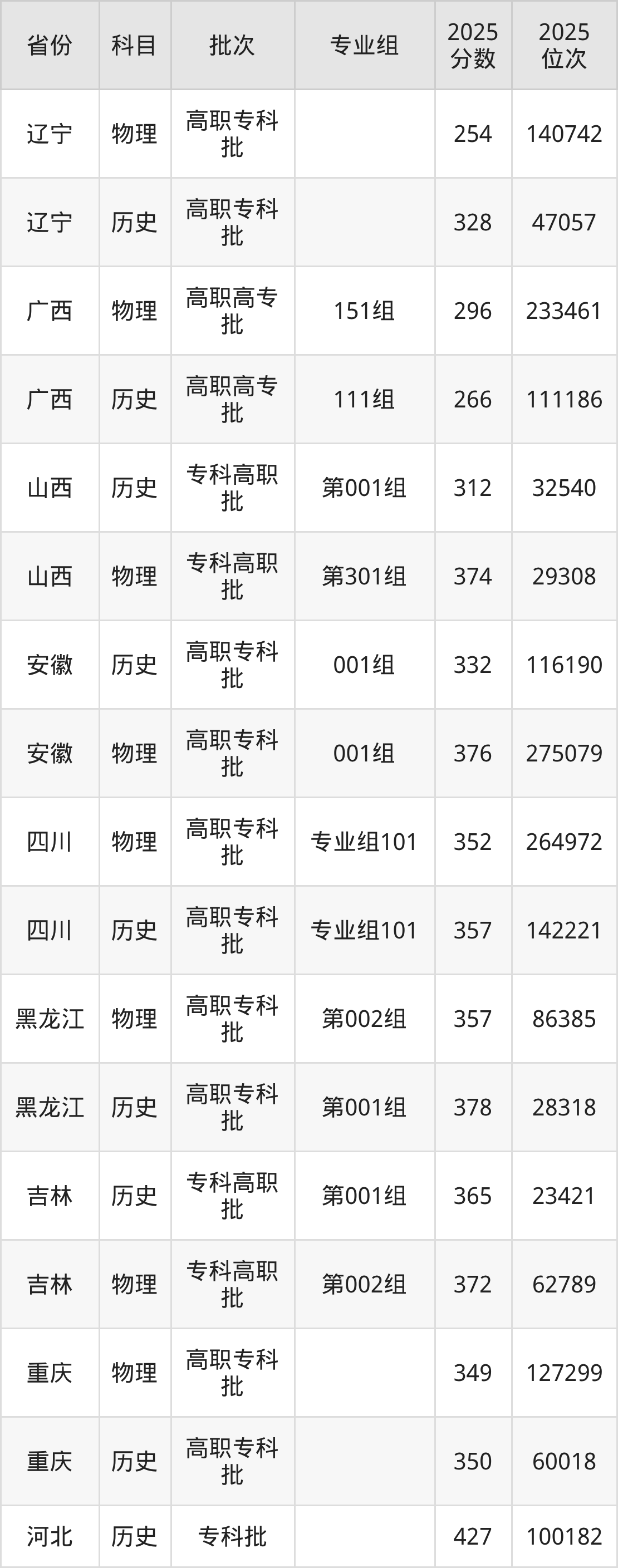 2025年在专科物理类进行招生,各专业组分数线详情如下: