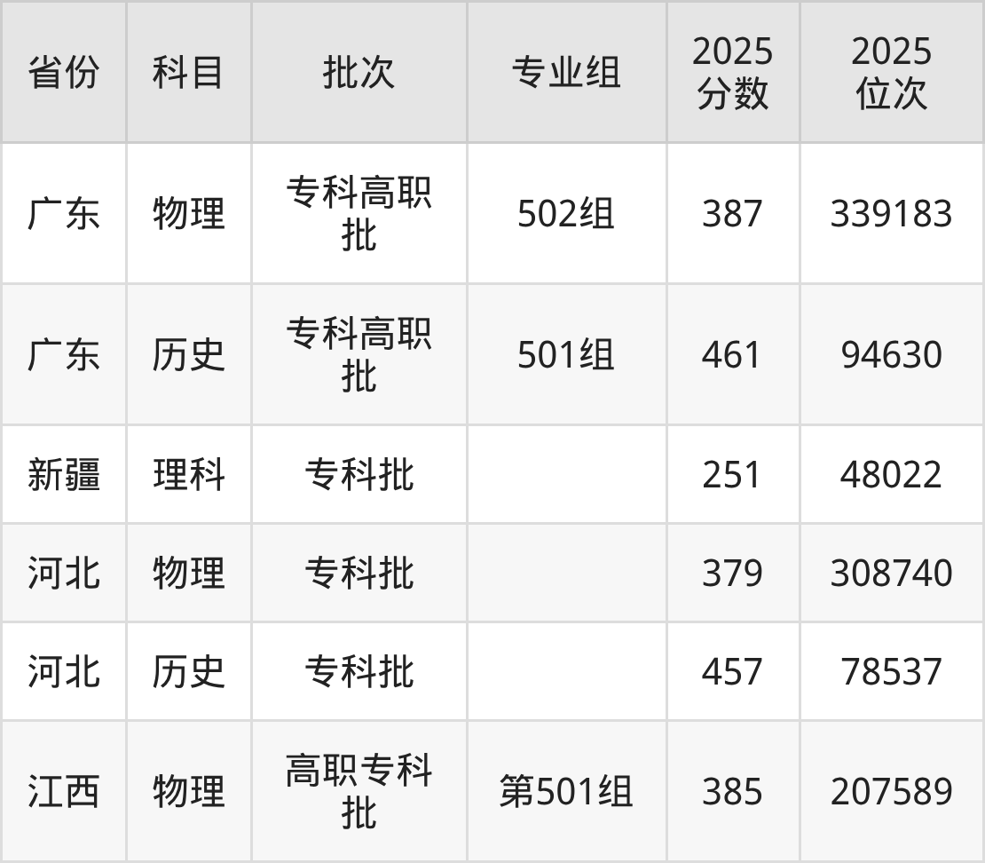 广东江门中医药职业学院502组:2025年投档录取最低分为387分,录取最低位次为339183名。