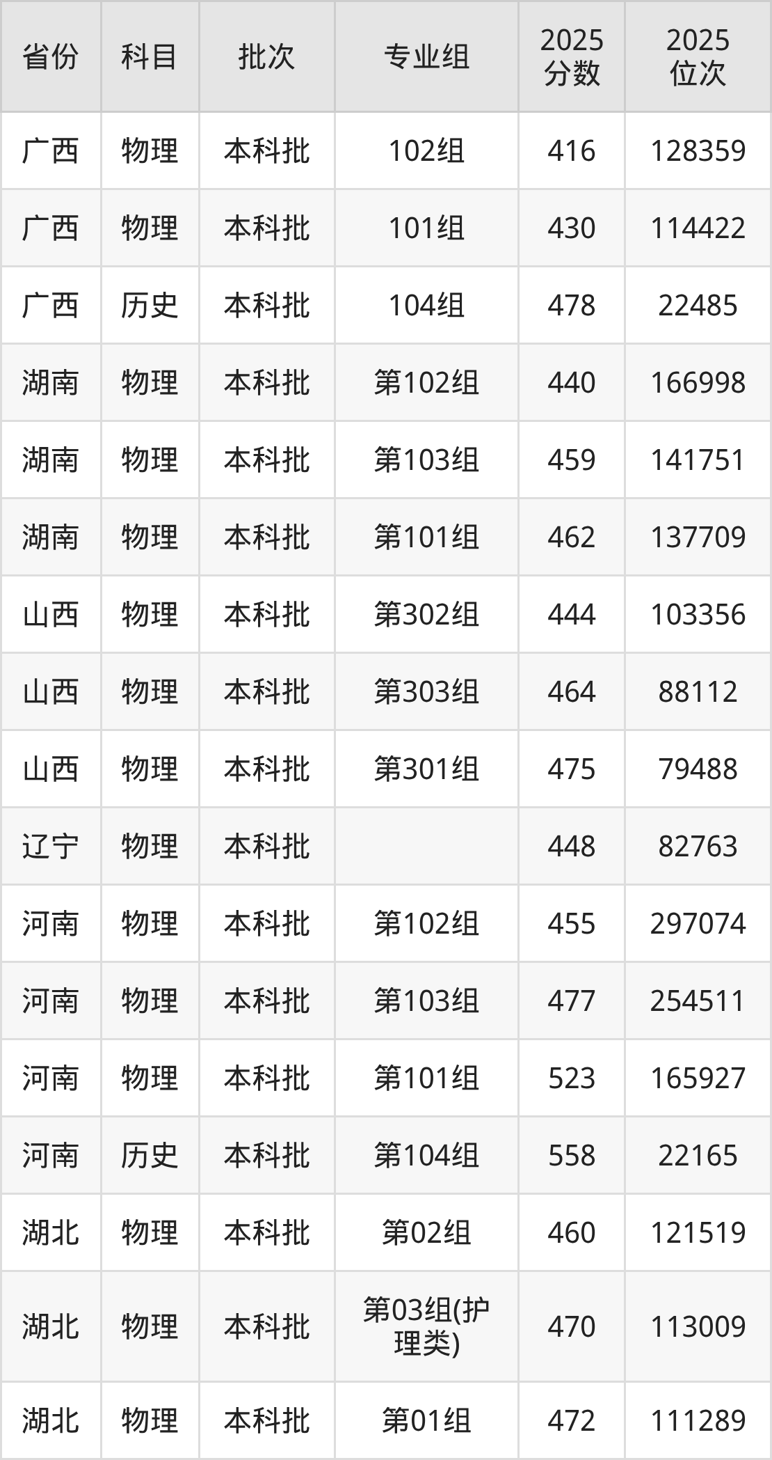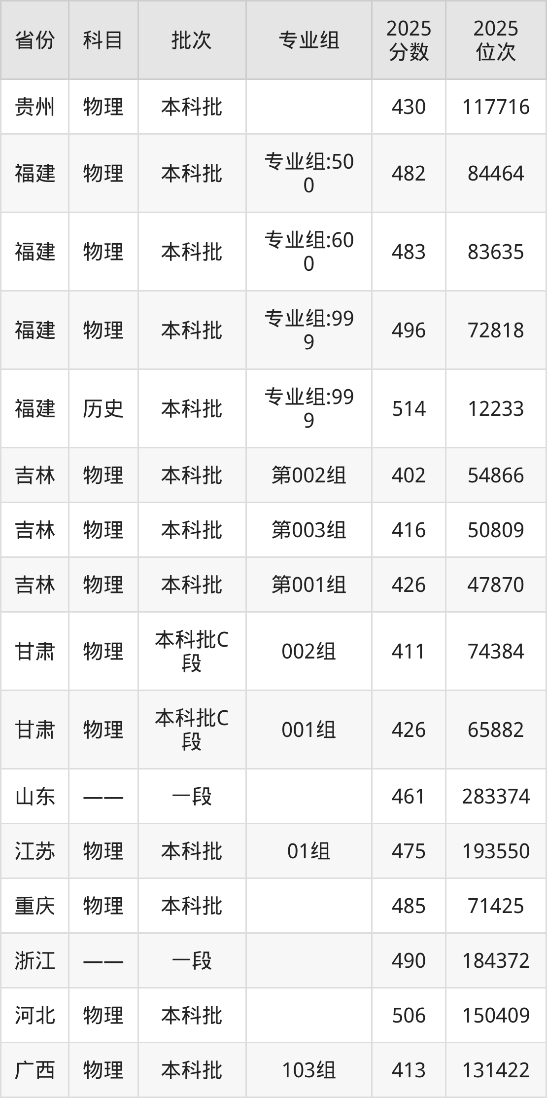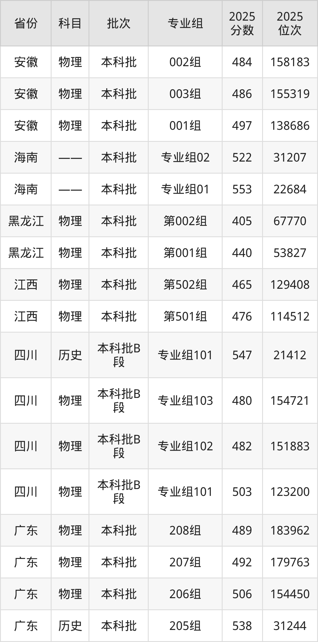 2025年在本科物理类进行招生,各专业组分数线详情如下: