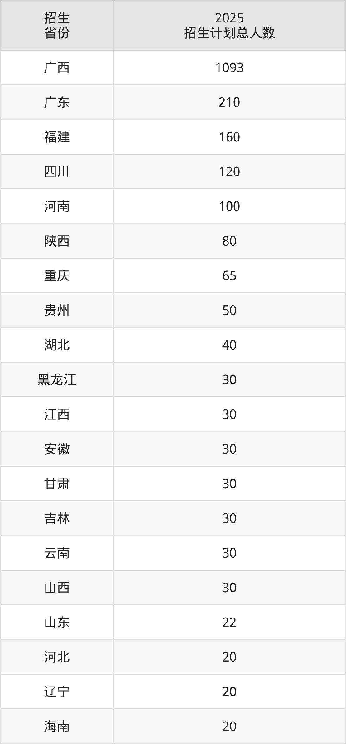 2025年广西中医药大学赛恩斯新医药学院面向全国22个省市开展本科招生;招生专业共11个,招生人数共2240人。2025年在广西壮族自治区招生计划总人数是1093人,其中,广西中医药大学赛恩斯新医药学院在广西壮族自治区招生人数最多的是中医学。广西中医药大学赛恩斯新医药学院在各省具体招生人数情况如下表。