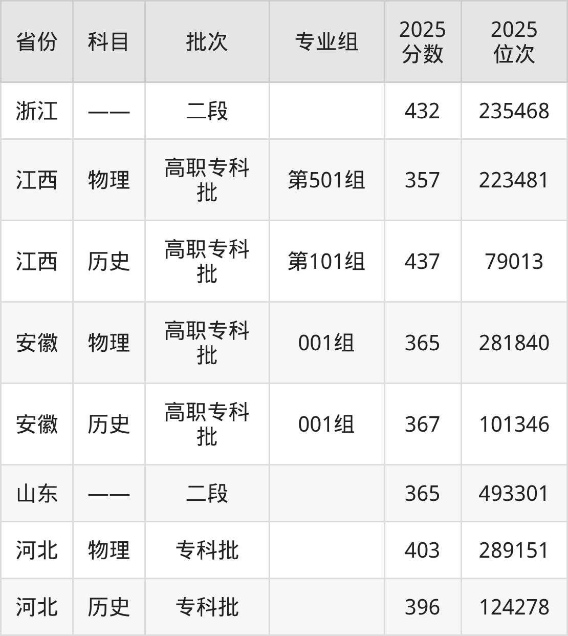 2025年安徽国际商务职业学院全国录取分数线是357分到437分,录取最低在江西物理类(第501组)、录取最高在江西历史类(第101组)。各省各专业组最低分具有差异,详情如下: