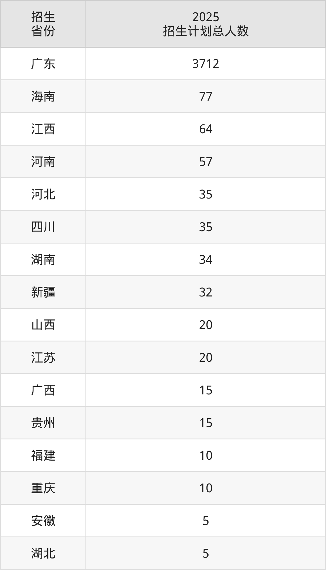 2025年广东工商职业技术大学面向全国16个省市开展本科招生;招生专业共27个,招生人数共3933人。2025年在广东省招生计划总人数是3712人,其中,广东工商职业技术大学在广东省招生人数最多的是机械设计制造及自动化。广东工商职业技术大学在各省具体招生人数情况如下表。