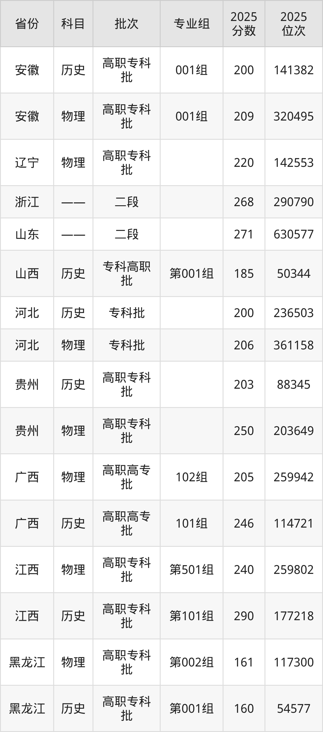 2025年黑龙江三江美术职业学院全国录取分数线是160分到290分,录取最低在黑龙江历史类(第001组)、录取最高在江西历史类(第101组)。各省各专业组最低分具有差异,详情如下: