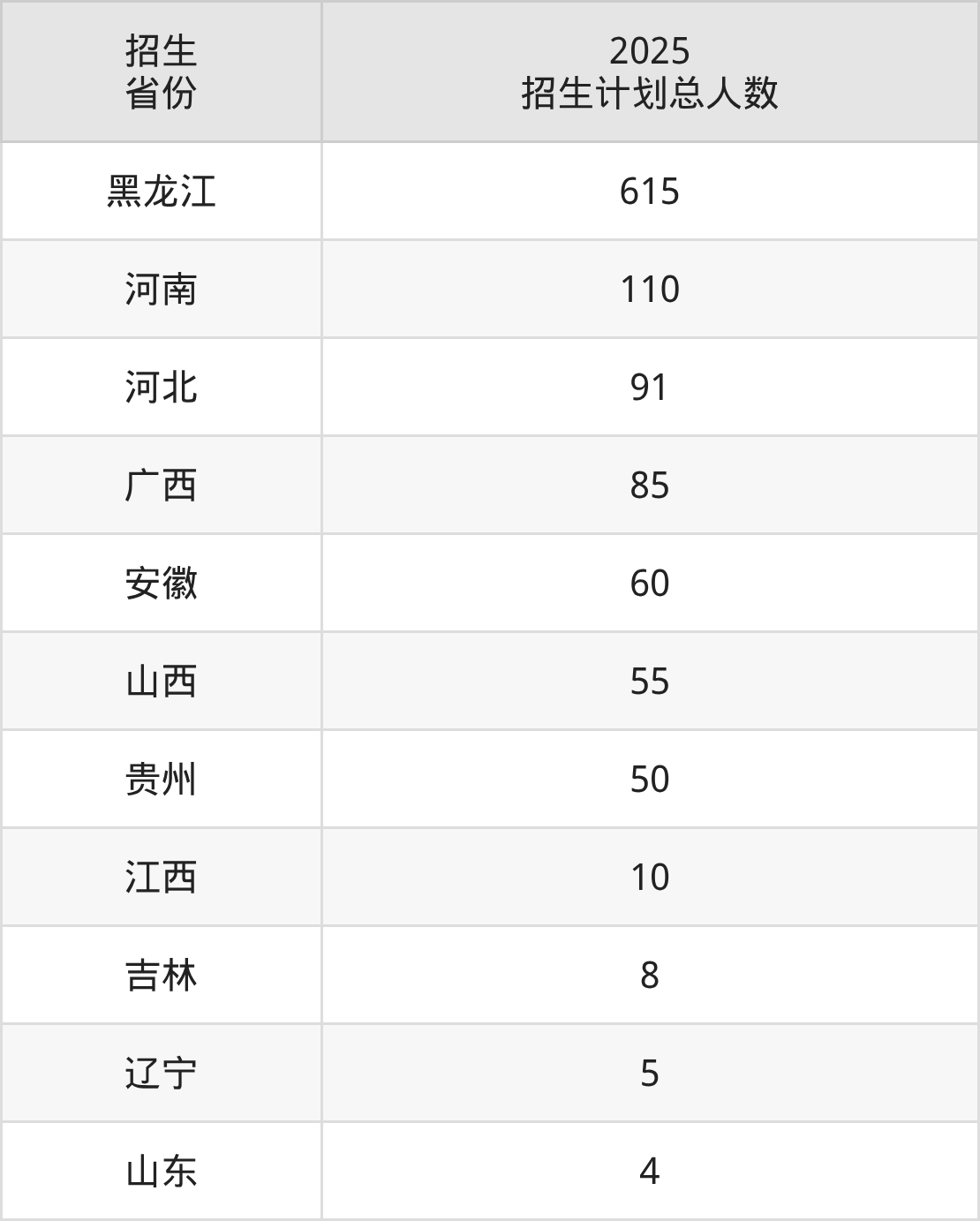 2025年黑龙江三江美术职业学院面向全国11个省市开展专科招生;招生专业共13个,招生人数共1093人。2025年在黑龙江省招生计划总人数是615人,其中,黑龙江三江美术职业学院在黑龙江省招生人数最多的是软件技术。黑龙江三江美术职业学院在各省具体招生人数情况如下表。