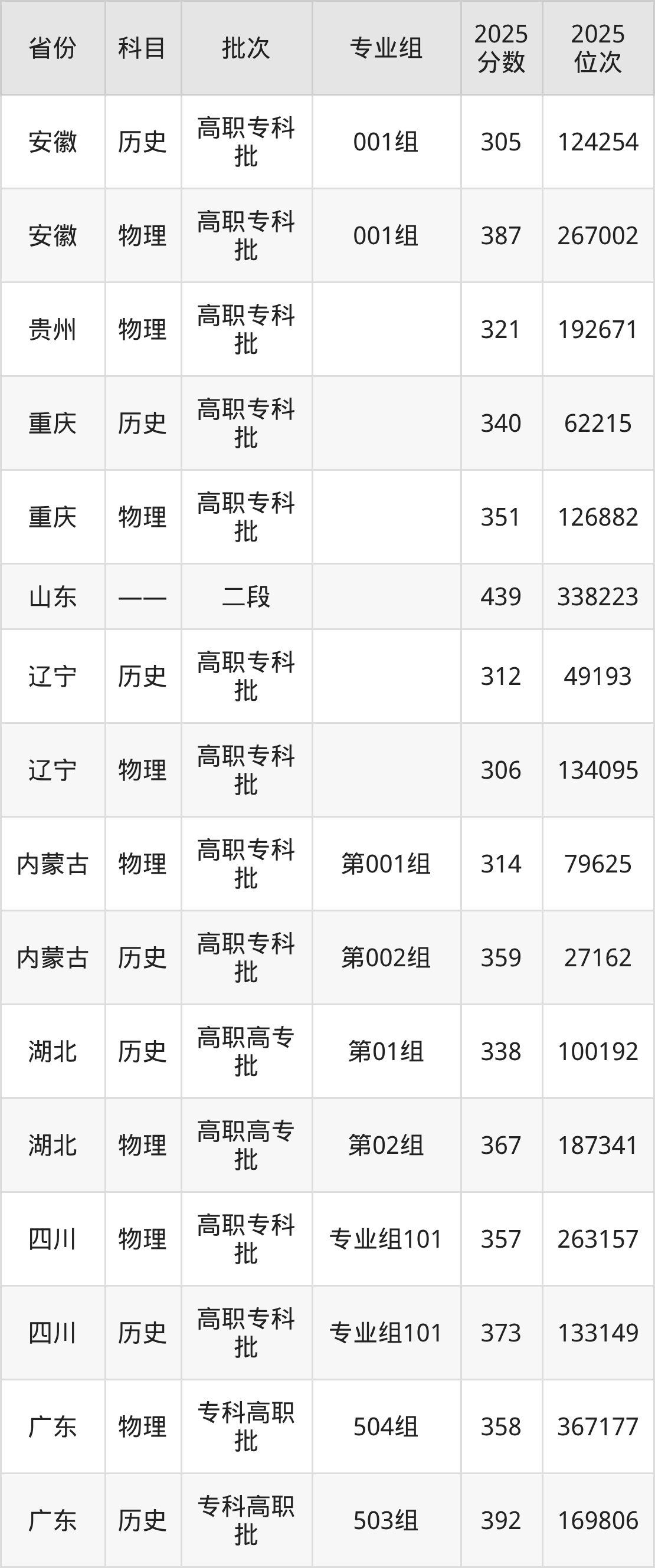 2025年在专科物理类进行招生,各专业组分数线详情如下: