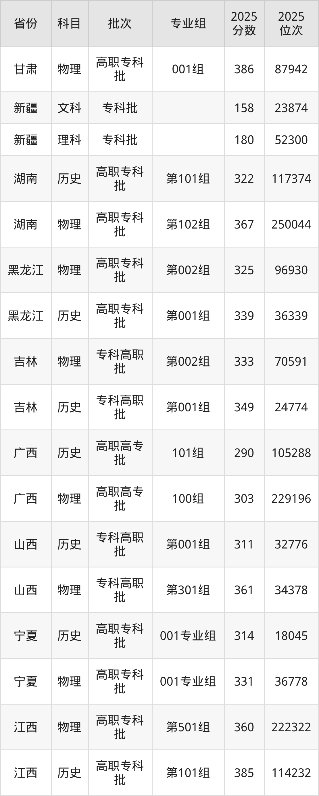 普通类专科历史类最低305分,专科物理类最低387分