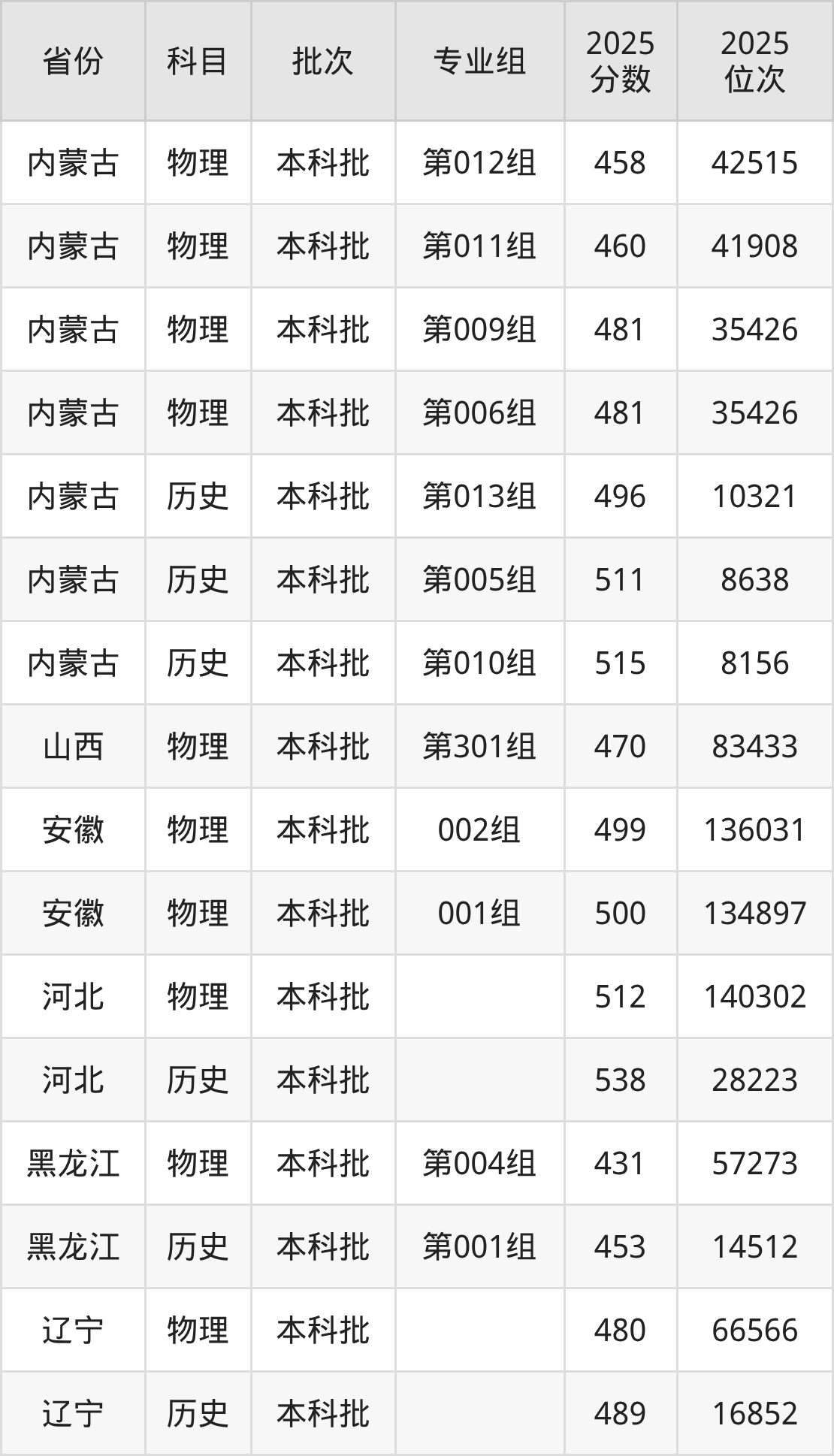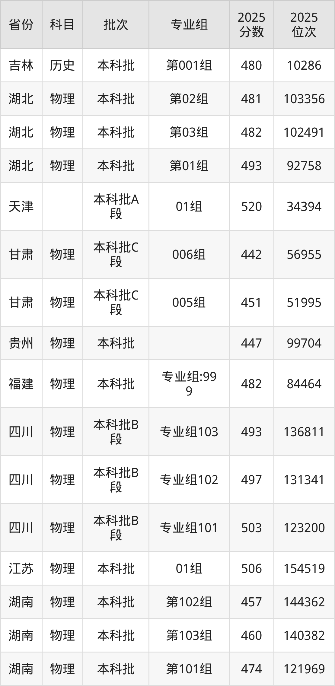 2025年在本科物理类进行招生,各专业组分数线详情如下:
